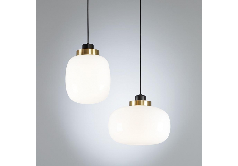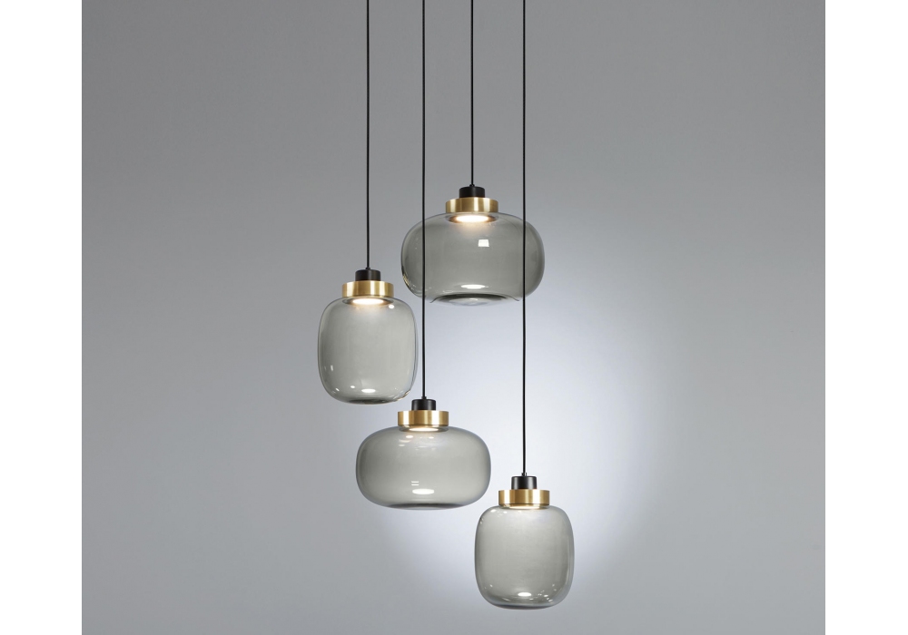 557 Leiger von Corrado Dotti für Tooy entworfen, ist ein LED-Kronleuchter mit sandschwarzer Struktur, Lampenanschluss aus Kupfer, gebürstetem Messing oder lackiert, während der Diffusor aus geblasenem Glasopalweiß oder geräuchertem Glas besteht. LED enthalten.