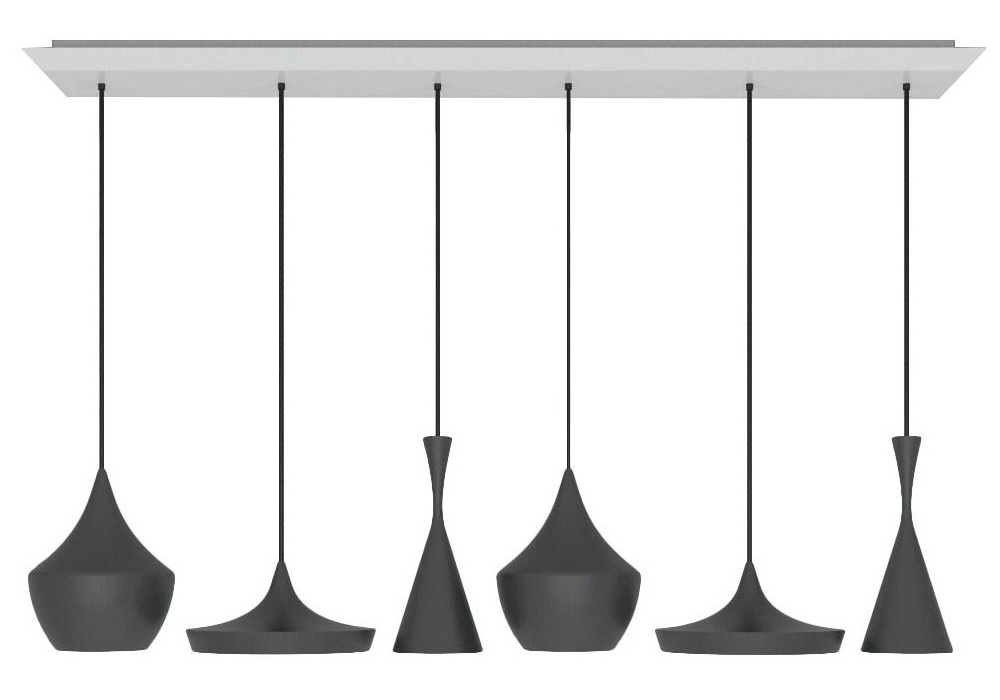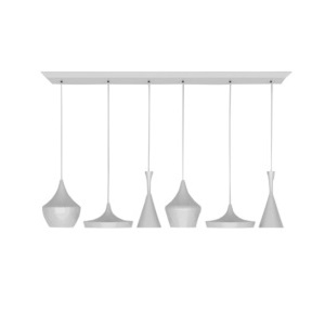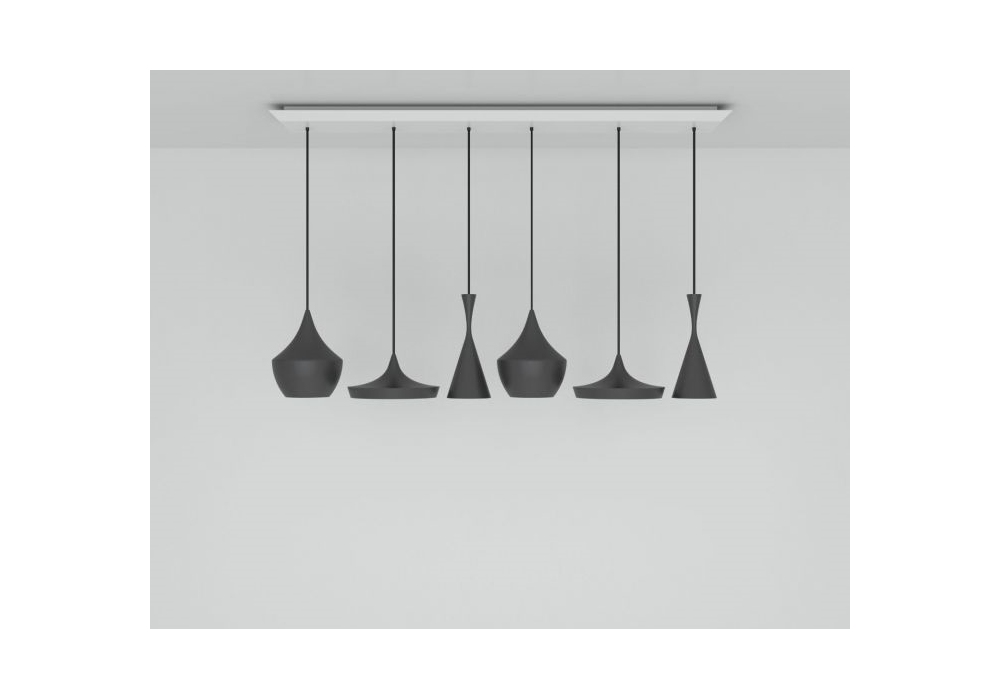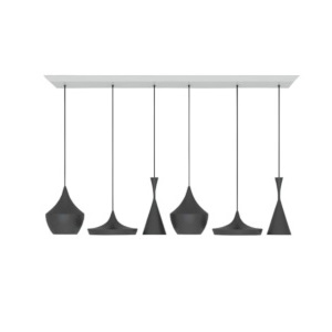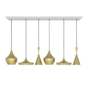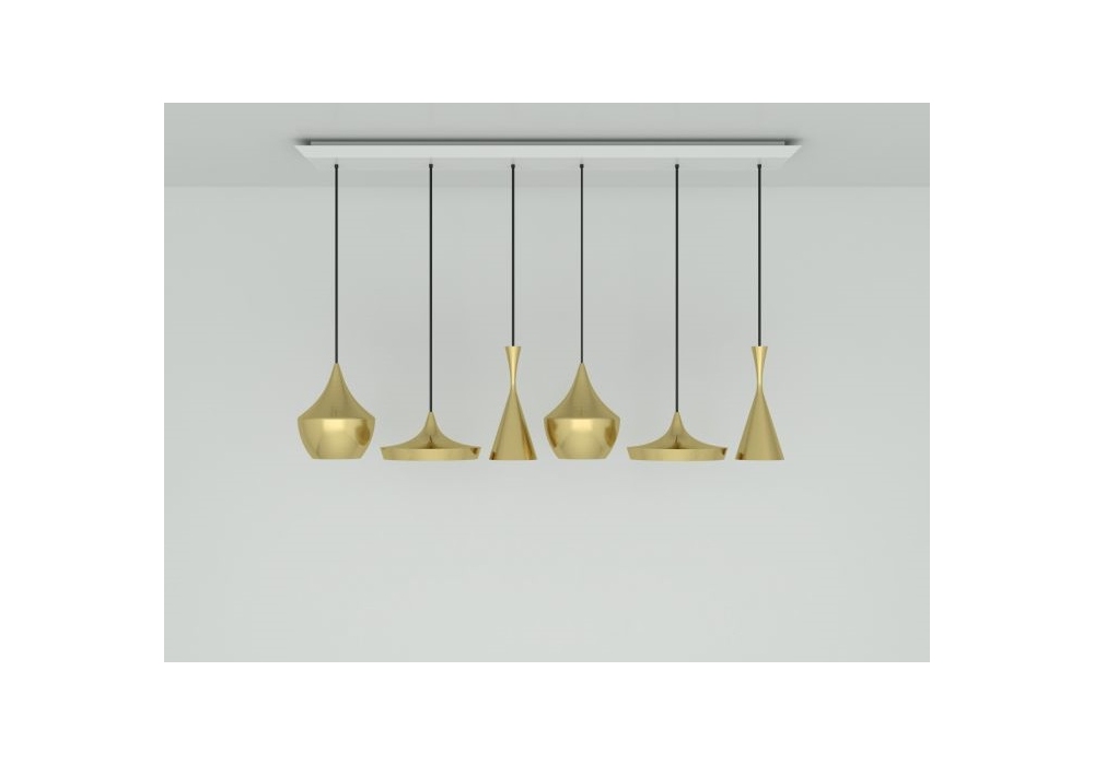 Beat Range Linear von Tom Dixon entworfen, ist ein Hängesystem bestehend aus sechs Messinglampen, innen in Goldfarbe. System in verschiedenen Ausführungen erhältlich.
