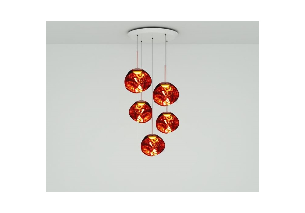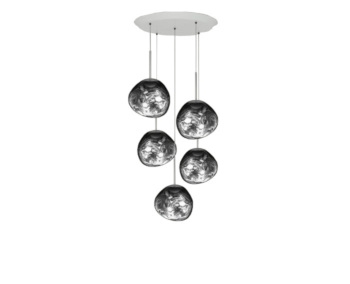Melt Mini Round von Tom Dixon entworfen, ist ein Aufhängesystem bestehend aus fünf Polycarbonat-Lampen. System in verschiedenen Ausführungen erhältlich.