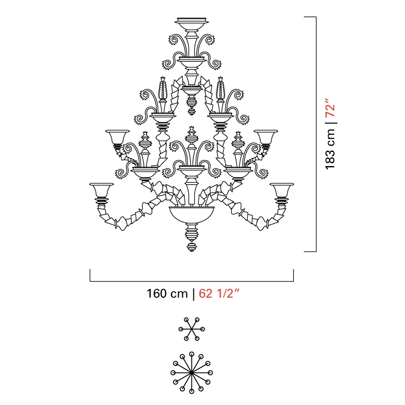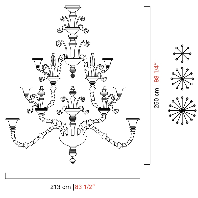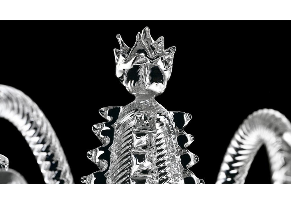 Venezia 1295 entworfen und hergestellt von Barovier & Toso ist ein mehrstufiger Kronleuchter mit tragender Struktur und Details aus verzinktem, goldfarbenem oder poliertem Chrommetall. Der Lampenkörper und die Arme sind mit kristallfarbenem venezianischem Glas überzogen und mit Dekorationen und Anhängern immer aus transparentem Kristall verziert. Als Lichtquellen kommen dimmbare LEDs oder Halogene zum Einsatz. Venezia 1295 ist in verschiedenen Modellen und Metallausführungen erhältlich.