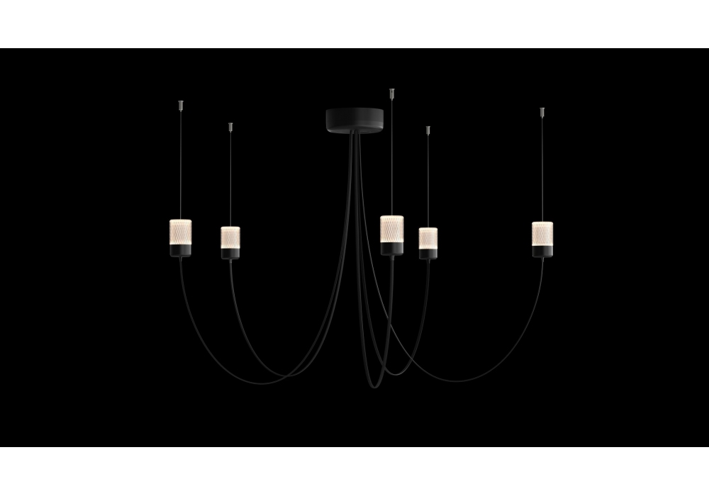 Gravity Chandelier von Paul Cocksedge für Moooi entworfen, ist ein dimmbarer LED-Kronleuchter aus facettierten Glasdiffusoren und schwarz pulverbeschichteter Stahlstruktur, ultradünnen Aufhängungsdrähten. Erhältlich in zwei Konfigurationen: fünf oder sieben Arme.