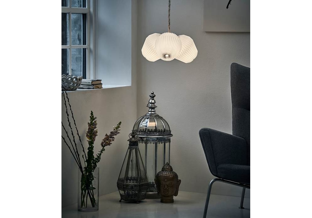 Der Bouquet Chandelier, entworfen von Sinja Svarrer für Le Klint, ist eine Hängeleuchte, die durch die Kombination von Kunststoff und Holz strukturiert ist. Die drei großen Lampenschirme bestehen aus Kunststoff- oder Papiermaterial mit einer Oberfläche mit regelmäßigen und präzisen Falten, um eine optimale Lichtstreuung zu gewährleisten. Das Lampengehäuse ist aus Eichenholz und verwendet LED- oder Halogenlichtquellen (nicht im Lieferumfang enthalten). Der Bouquet Kronleuchter ist in verschiedenen Größen erhältlich.