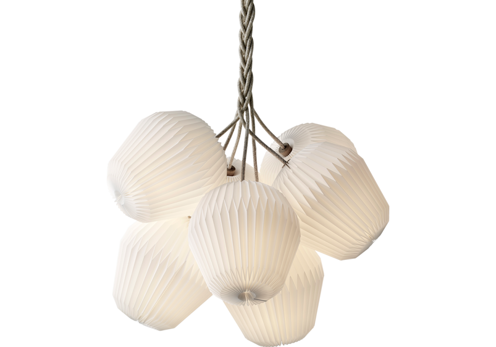 Die von Sinja Svarrer für Le Klint entworfene Bouquet 7 ist eine Hängeleuchte, die durch die Kombination von Kunststoff und Holz strukturiert ist. Die sieben großen Lampenschirme bestehen aus Kunststoff- oder Papiermaterial mit einer Oberfläche mit regelmäßigen und präzisen Falten, um eine optimale Lichtstreuung zu gewährleisten. Das Lampengehäuse ist aus Eichenholz und verwendet LED- oder Halogenlichtquellen (nicht im Lieferumfang enthalten). Der Bouquet 7 ist in verschiedenen Größen erhältlich.