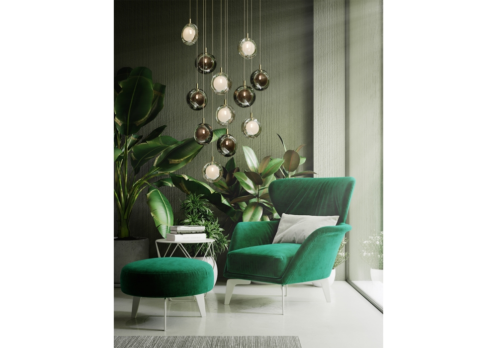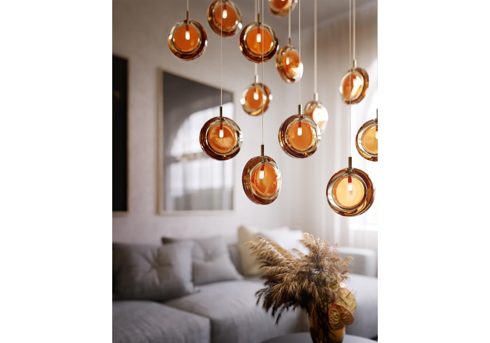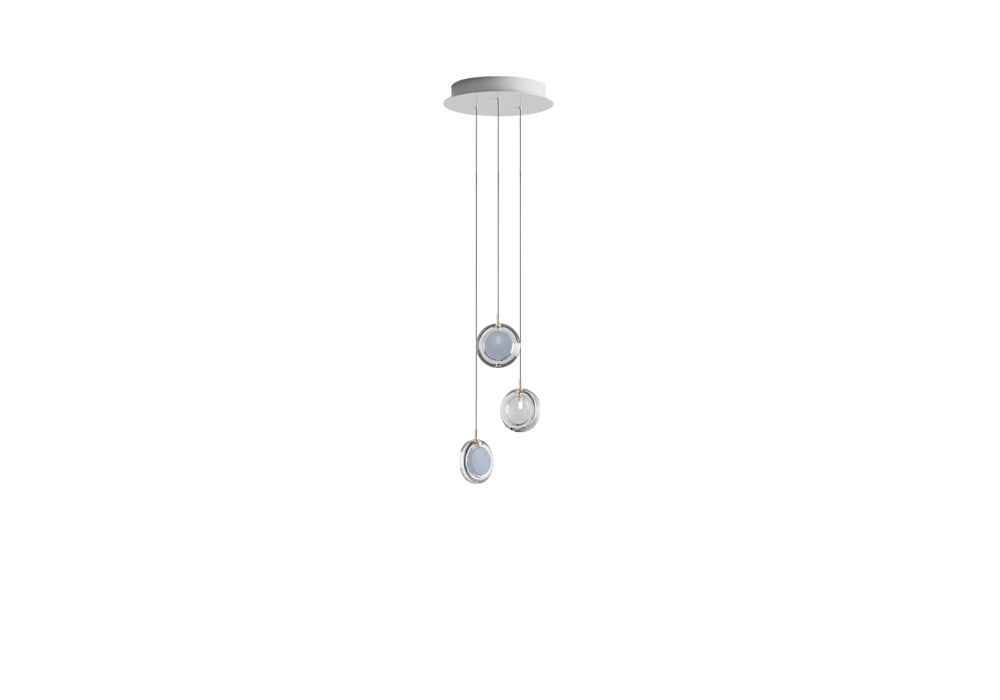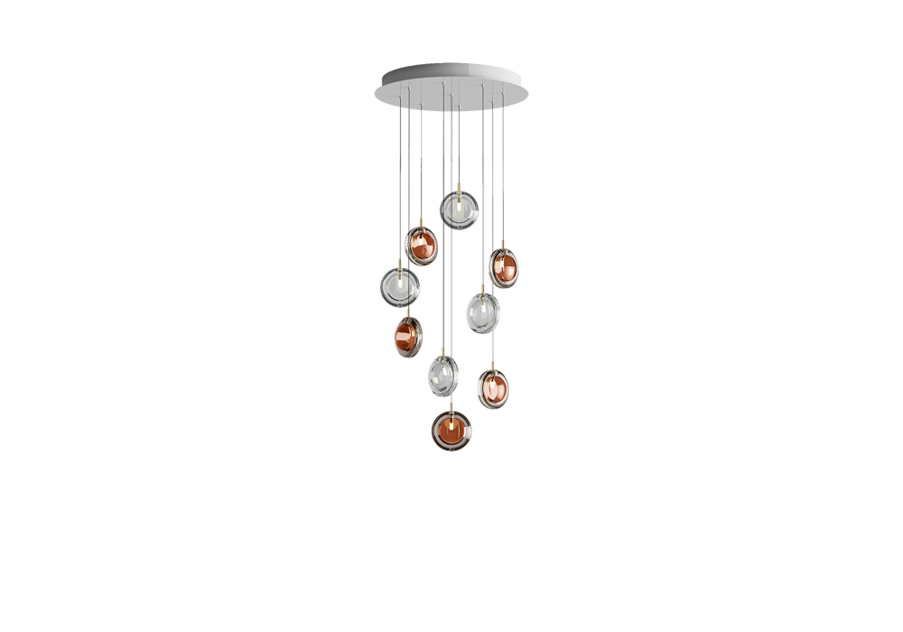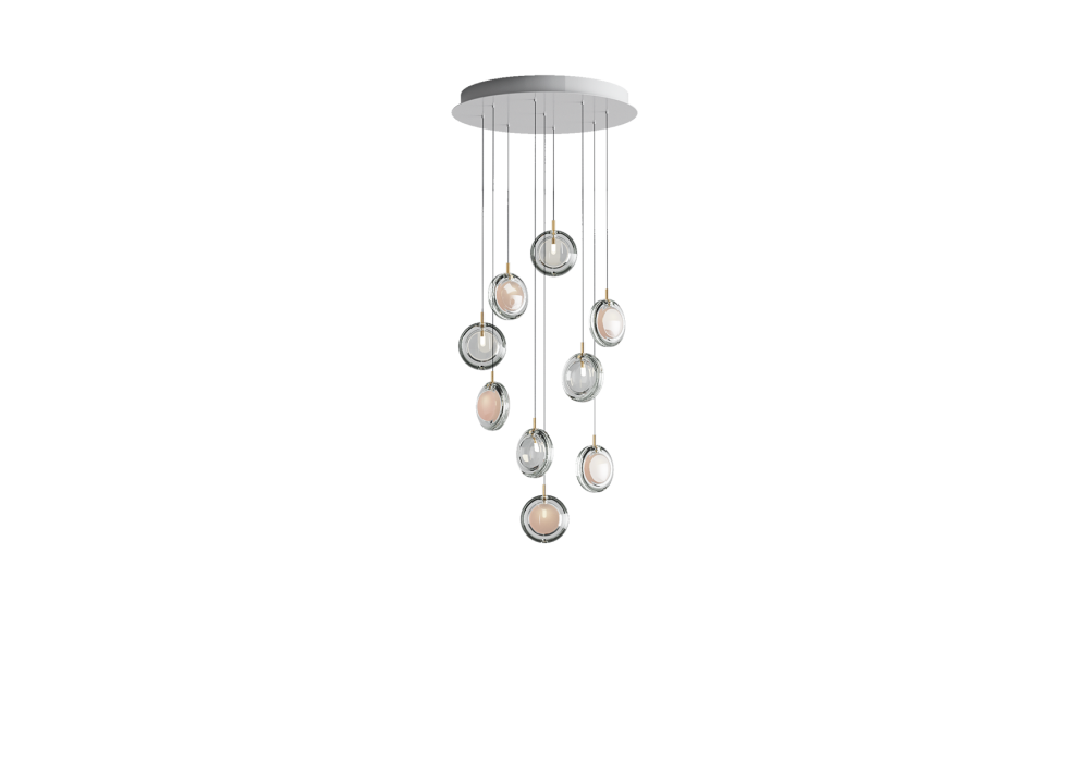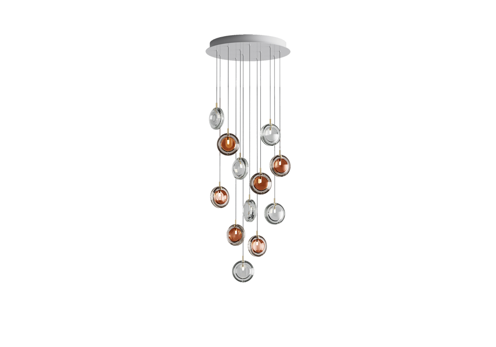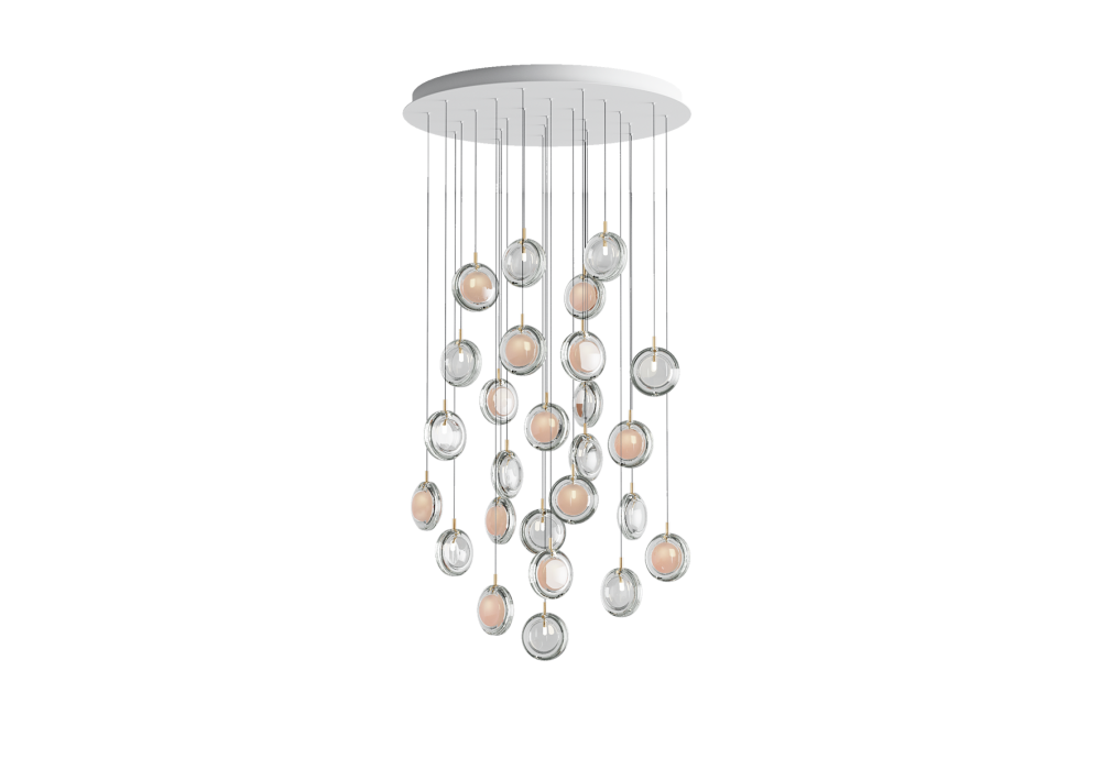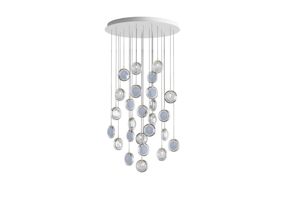 Lens von Studio deFORM für Bomma entworfen, ist ein Leuchter mit handbemalten Diffusoren aus Pressglas. Es ist in verschiedenen Ausführungen und Konfigurationen erhältlich.