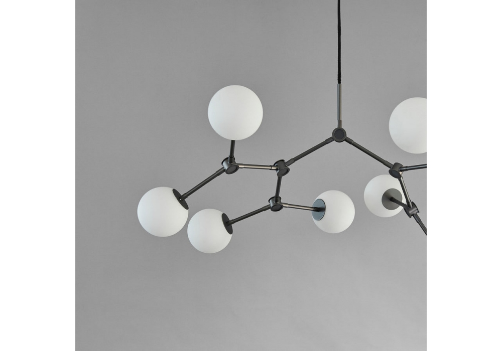 Drop Bulp Mini von Kristian Sofus Hansen & Tommy Hyldahl für 101 Copenhagen entworfen, ist ein Kronleuchter aus Metall in grauer Ausführung und Lampenschirmen aus Opalglas.