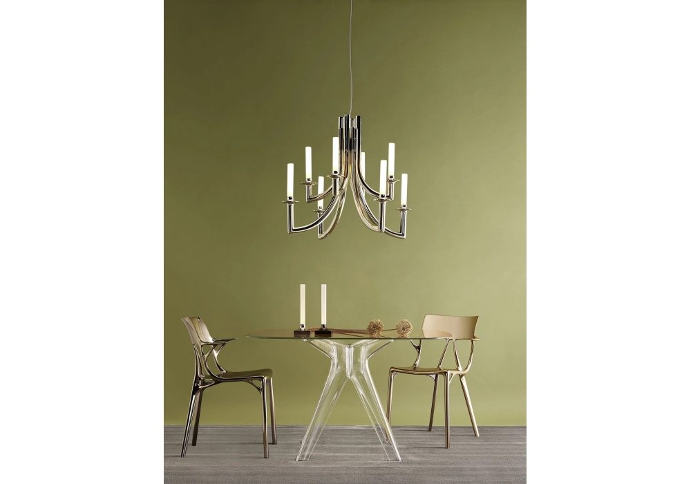 Khan Metal von Philippe Starck für Kartell entworfen, ist ein Leuchter aus Polycarbonat 2.0 aus nachwachsendem Rohstoff, lackiert in matt bronze oder glänzend champagnermetallic.