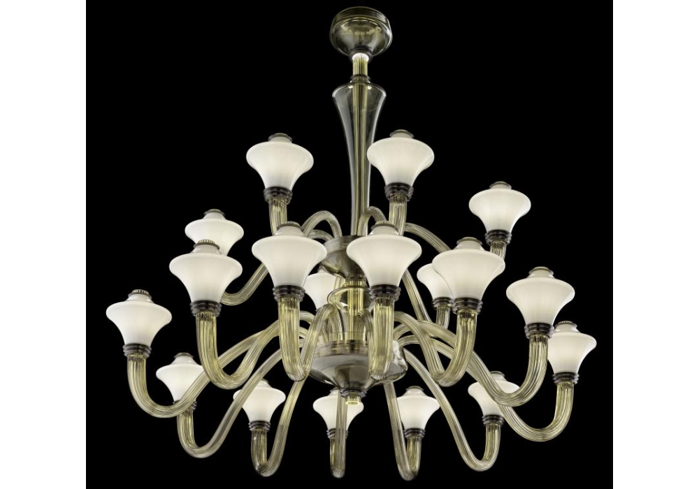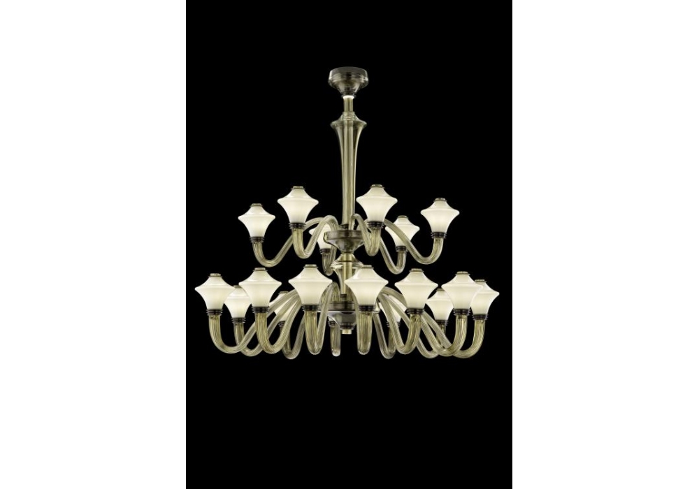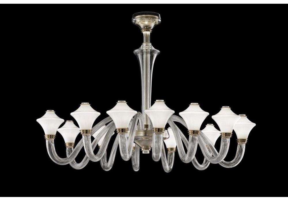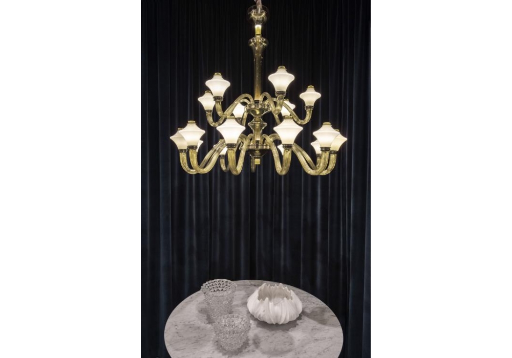 Metropolis entworfen und hergestellt von Barovier & Toso ist ein ein- oder mehrstufiger Leuchter mit Tragstruktur und Details aus gebürstetem schwarzem Nickel oder gebürstetem Goldmetall. Der Lampenkörper und die Arme sind mit venezianischem Glas mit gestreifter Oberfläche überzogen. Die eingesetzten Lichtquellen sind dimmbare LEDs. Metropolis ist in verschiedenen Modellen und Ausführungen erhältlich.