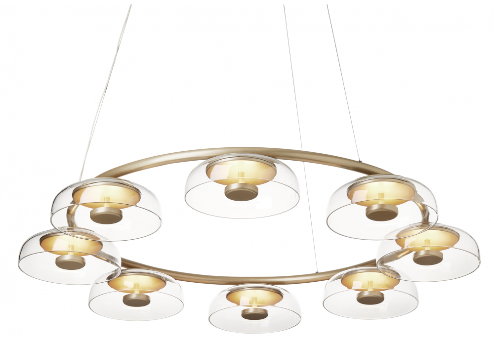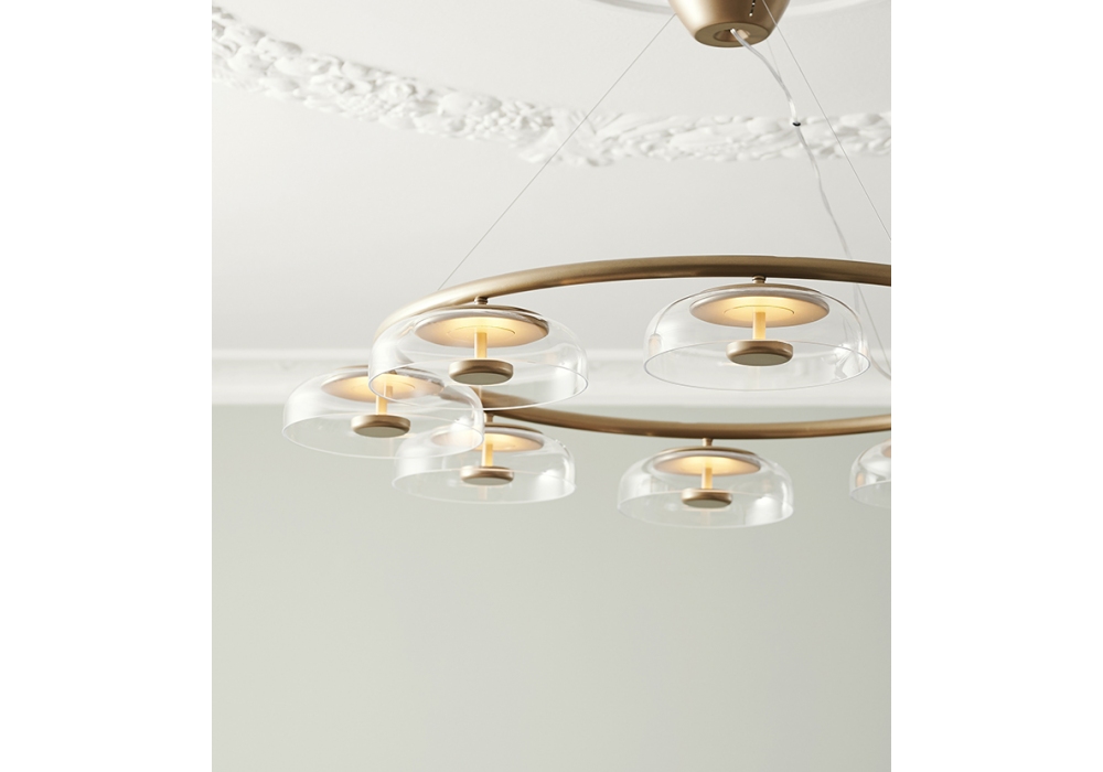 Blossi von Sofie Refer für Nuura entworfen, ist ein Leuchter, der sich durch einen Metallring in nordischem Goldfinish und 6 oder 8 Diffusoren aus transparentem mundgeblasenem Glas auszeichnet.