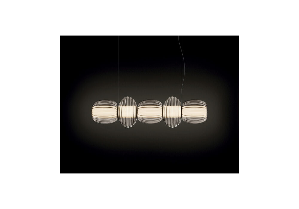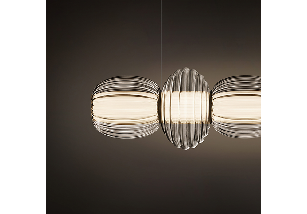 Alma von Controvento für Contardi entworfen, ist ein Leuchter aus mundgeblasenem Glas und einem plissierten Stoffdiffusor. Er verfügt über einen speziell angefertigten LED-Streifen, der per Phasenanschnittsdimmung (Triac) dimmbar ist und über DALI-, 1–10V- oder CASAMBI-Optionen verfügt.