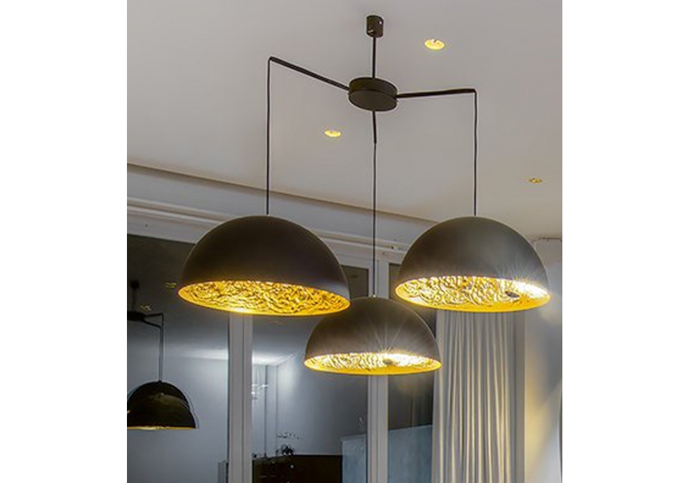 Stchu-Moon 02 Chandelier von Enzo Catellani für Catellani & Smith entworfen, ist eine LED-Pendelleuchte mit drei Diffusoren, die in verschiedenen Größen erhältlich sind. Jeder Diffusor ist eine Aluminiumhalbkugel mit einer unregelmäßigen Innenfläche, die mit Blättern in verschiedenen Farben bedeckt ist. Das Äußere des Diffusors ist mattschwarz. Der Lampenfassungslöffel, der jedes Leuchtmittel enthält, ist aus Metall.