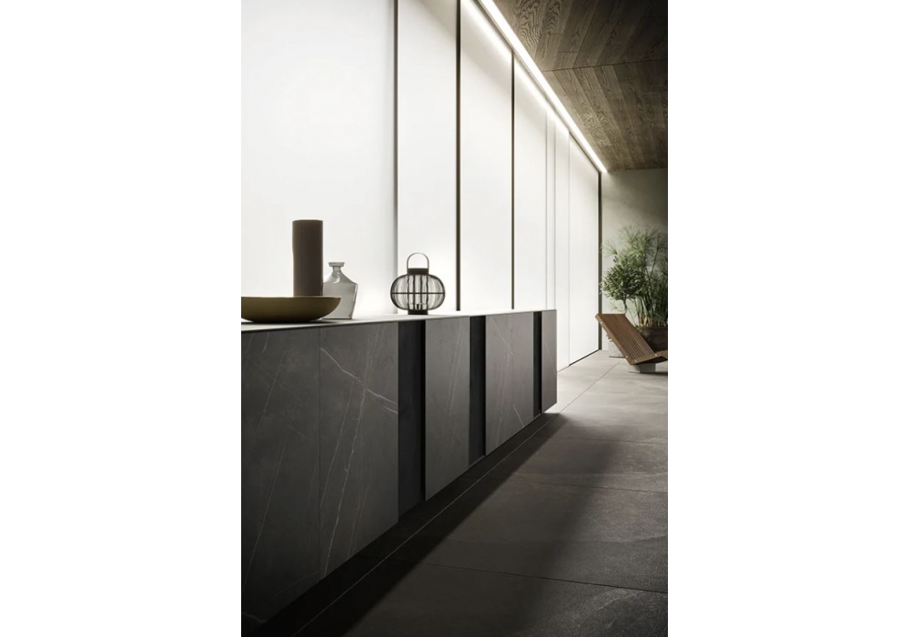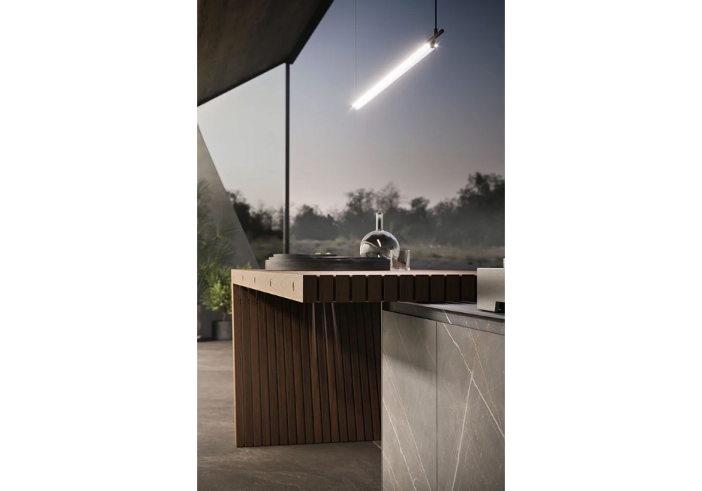 Project 04, entworfen und hergestellt von Modulnova, ist ein Küchensystem bestehend aus Unterschränken Skill und Arbeitsplatten aus Steinzeug Sahara Noir Raw, Sideboard Sipario mit Flügeltüren aus Steinzeug Sahara Noir Raw und nach hinten gerichteten Fronten aus Black Dust Metall. Die XY-Halbinsel ist aus wärmebehandeltem massivem Eschenholz, Light-Version und der Einhebelmischer ist mit klappbarem Auslauf, Black Steel-Finish. Mate-Kochfelder sind freistehend und beinhalten: Barbecue, Induktion und Teppanyaki. Jedes Element dieses Systems kann in verschiedenen Materialien und Ausführungen hergestellt werden. Wenden Sie sich an unseren Kundendienst, um es nach Ihren Wünschen zu konfigurieren.