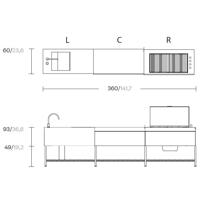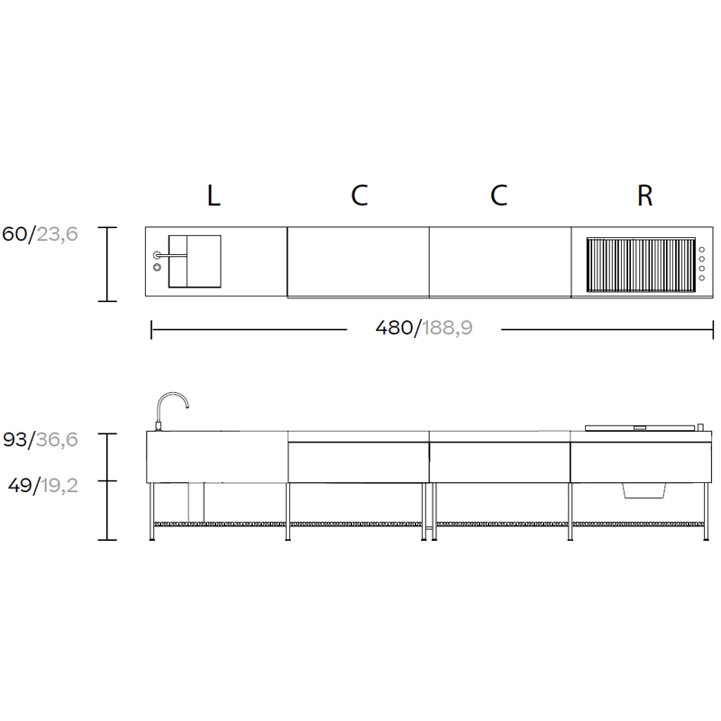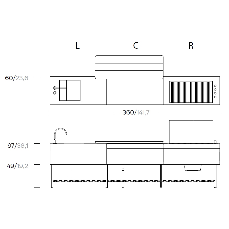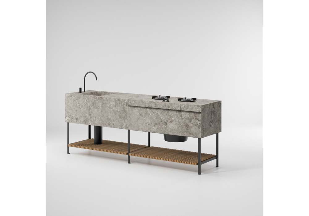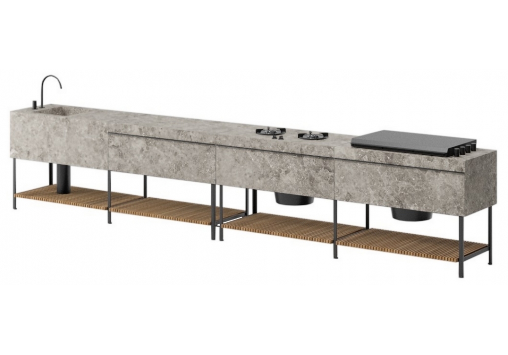 Base Kitchen von Kettal Studio ist eine modulare Außenküche die in verschiedenen Konfigurationen erhältlich ist. Sie umfasst eine Küche mit Gasherd, Grill, Spüle, Arbeitsplatte und Unterregal aus Teakholz. Für eine individuelle Konfiguration wenden Sie sich bitte an unseren Kundenservice.