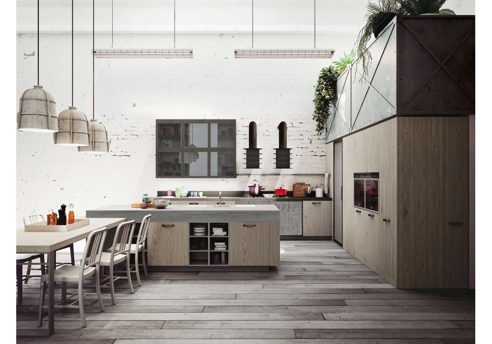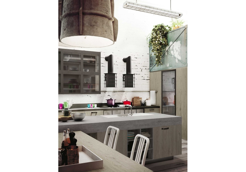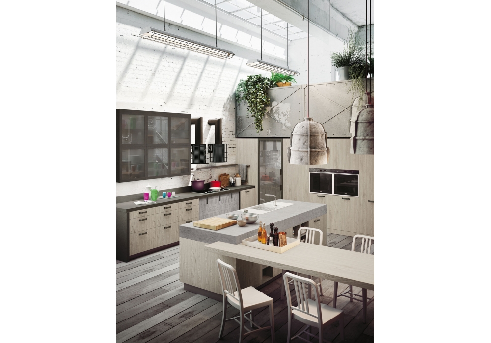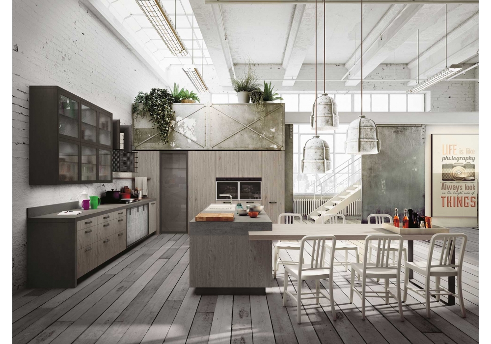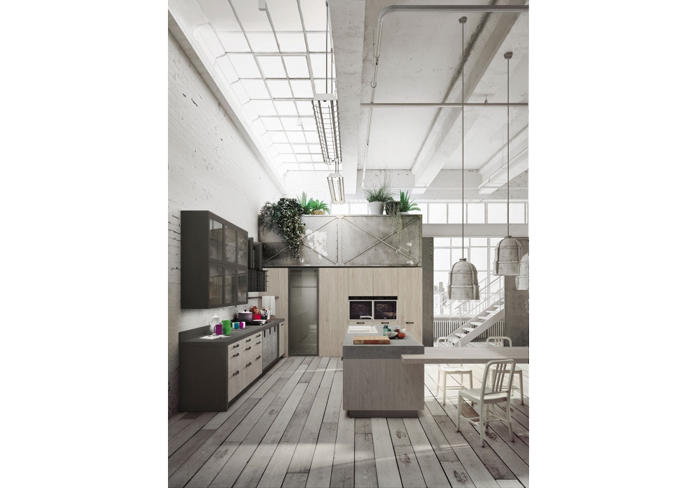 Loft, von Michele Marcon für Snaidero entworfen, ist eine Küche, die an Trends und "urbane" Linien erinnert. Die Türen sind in den Ausführungen ABS, MDF oder Massivholz erhältlich. Die Platten können in Spanplatten für feuchte Umgebungen mit laminierten Kratzern, Marmor, Granit, Quarz, Edelstahl, Solid Surface oder "Board" Block bedeckt werden.