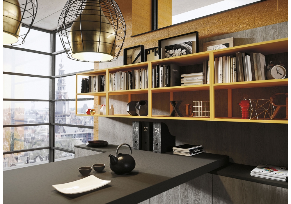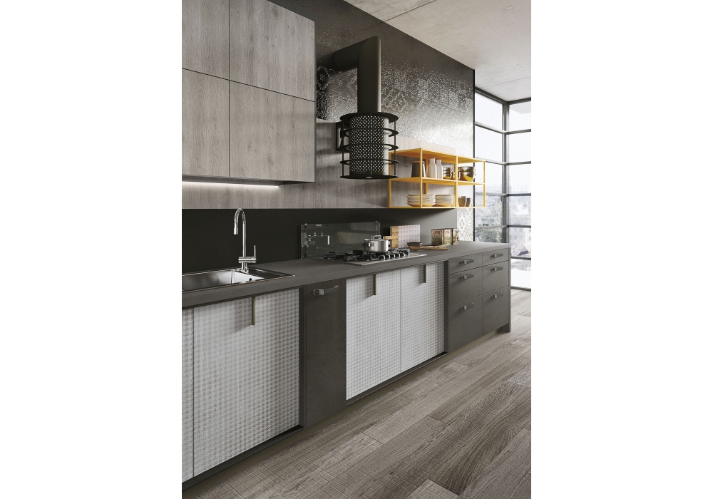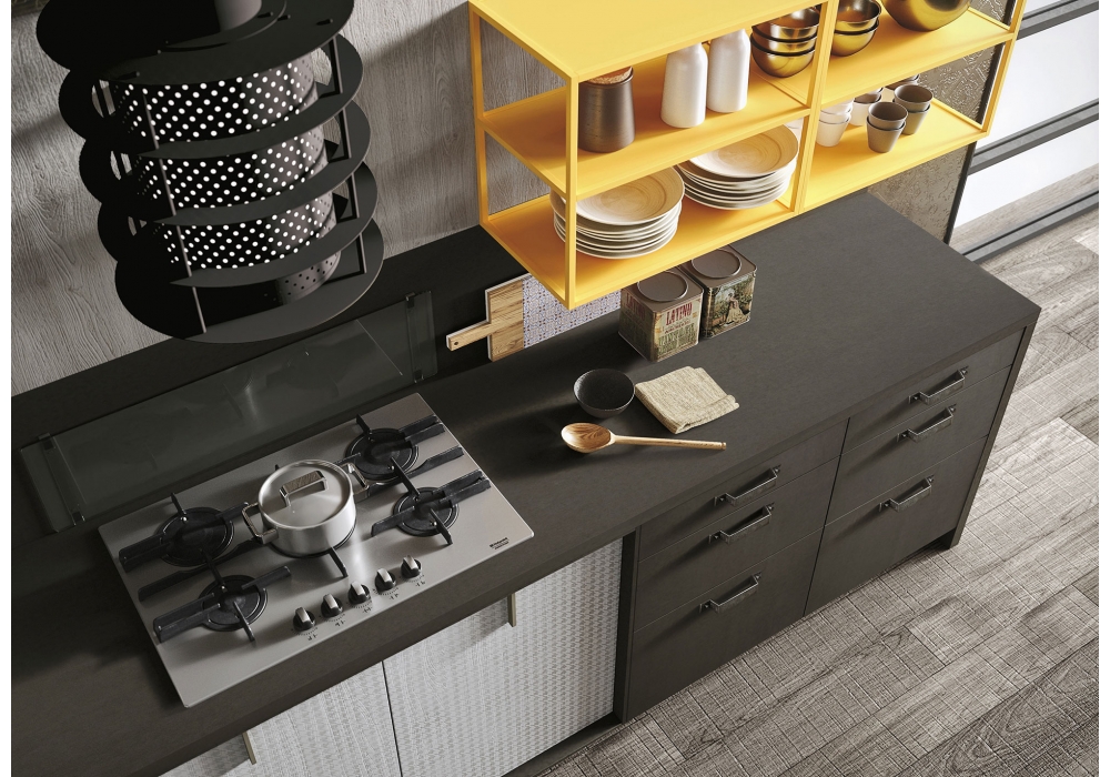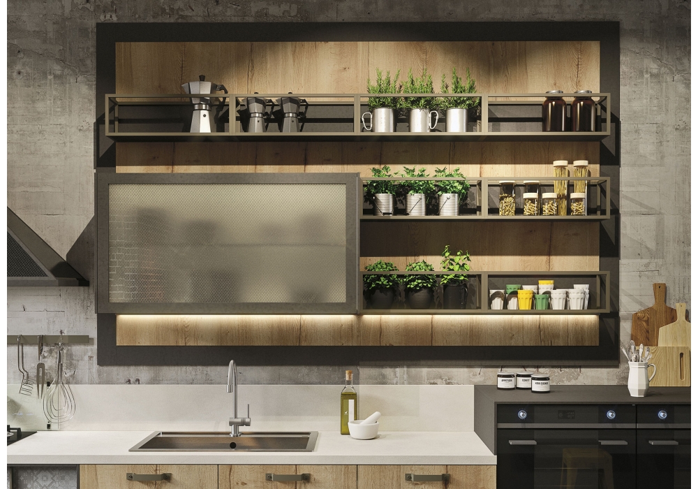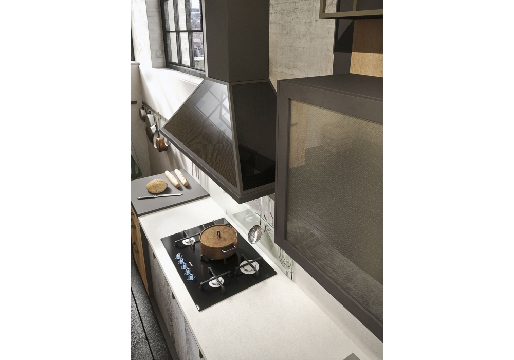 Loft, von Michele Marcon für Snaidero entworfen, ist eine Küche, die an Trends und "urbane" Linien erinnert. Die Türen sind in den Ausführungen ABS, MDF oder Massivholz erhältlich. Die Platten können in Spanplatten für feuchte Umgebungen mit laminierten Kratzern, Marmor, Granit, Quarz, Edelstahl, Solid Surface oder "Board" Block bedeckt werden.