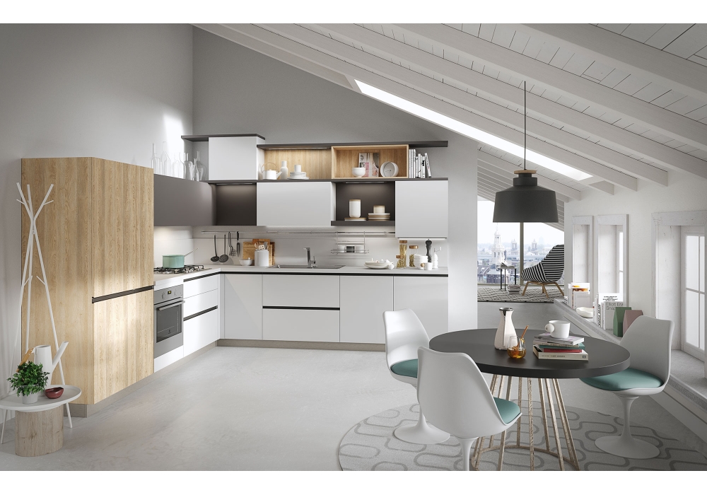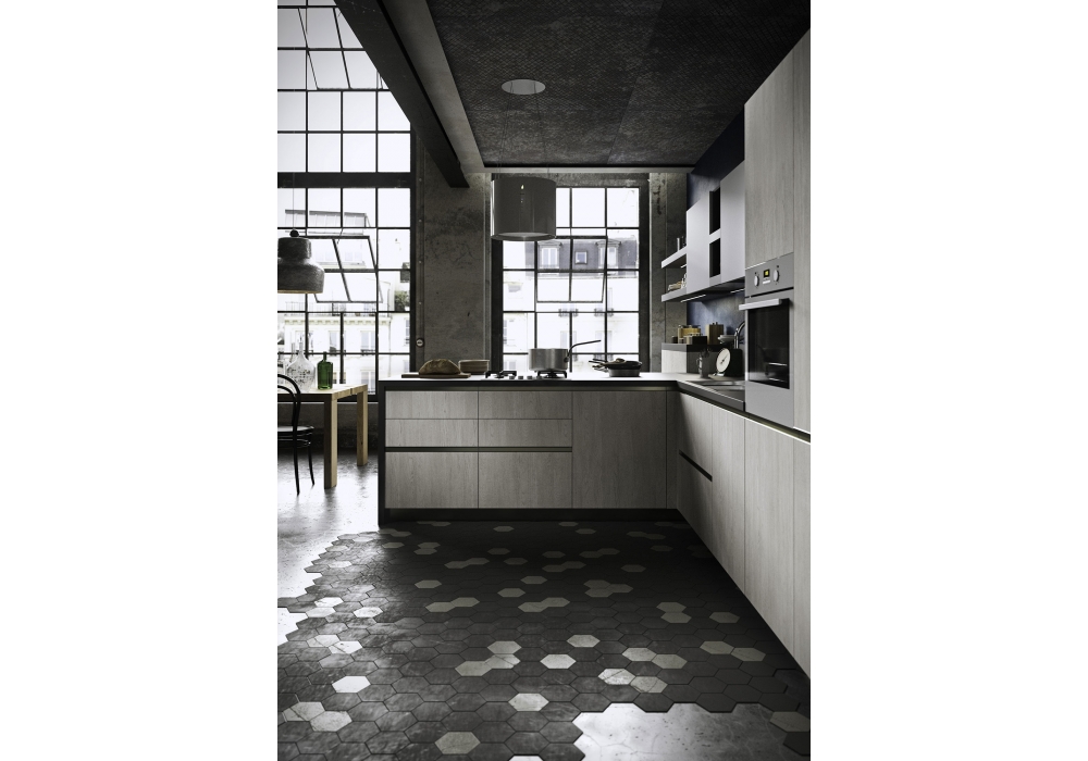 Die Joy-Küche von Snaidero hebt die bleibenden Werte der Materialien und ihrer Kombination in jedem Detail hervor. Die Türen sind aus ABS und die Platten können aus Spanplatten für feuchte Umgebungen bestehen, die mit kratzfestem HPL-Laminat oder Quarz beschichtet sind.