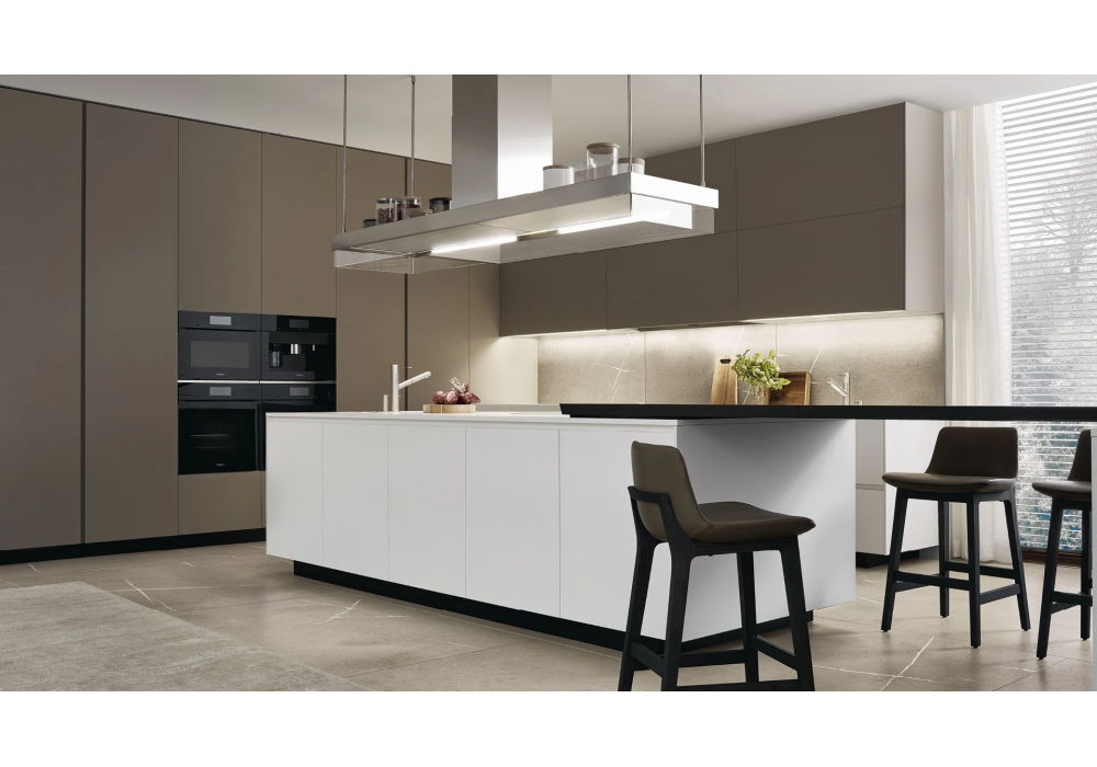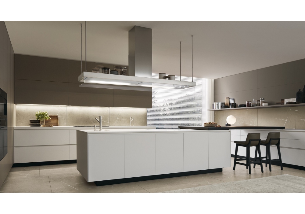 Alea von Poliform entworfen, ist eine Küche mit einer wesentlichen Form und einem rigorosen Design, das eine sehr hohe betriebliche Kapazität hat. Die Türen können aus Laminat, Melamin, Lack, Acryl, Holz, Stahl oder Glas bestehen. Die Oberteile in Holz, Laminat, Corian, Stahl, Marmor, Quarzit, Stein oder Dekton. Die Snack-Tops in Lack, Corian, Stein, Marmor, Holz und Laminat.