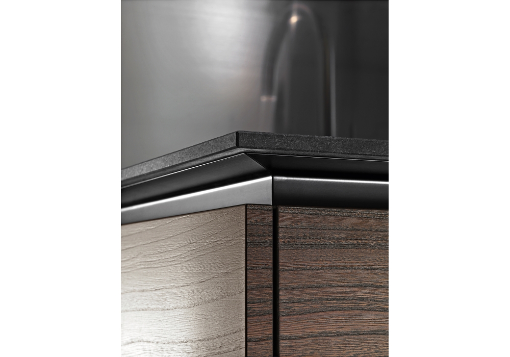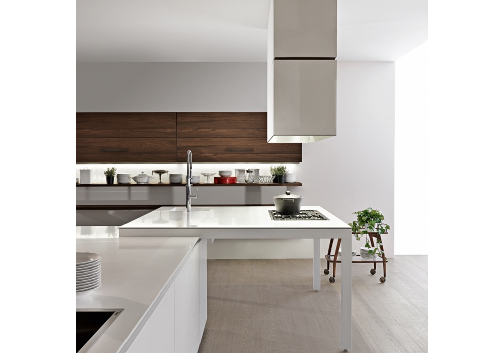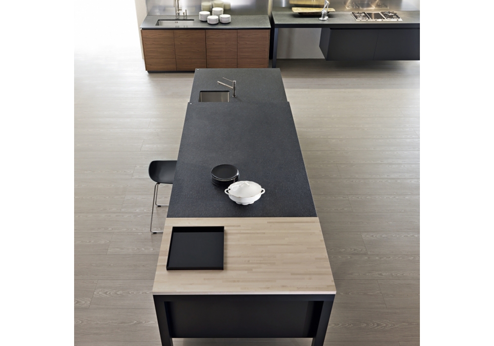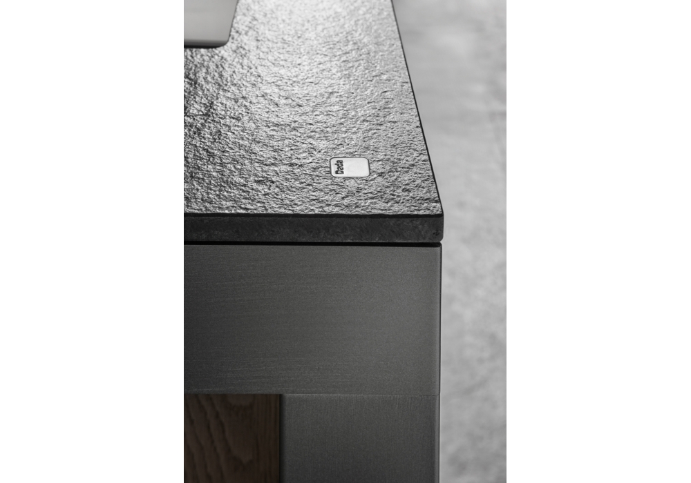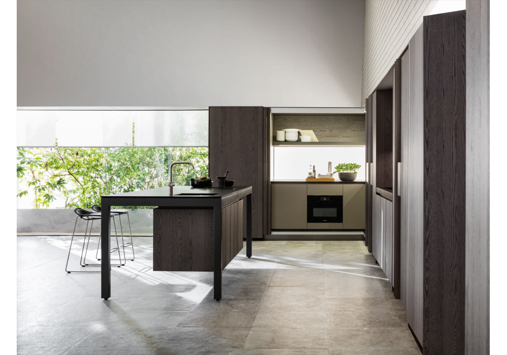 Banco, von Luca Meda für Molteni&C entworfen, ist eine Küche mit einer festen Aluminiumstruktur. Die Türen können lackiert oder in Holz ausgeführt werden, während die Tops laminiert sind, in fenix®, cartapietra, dekton, silestone, Naturstein, Glas, Corian® oder Edelstahl.