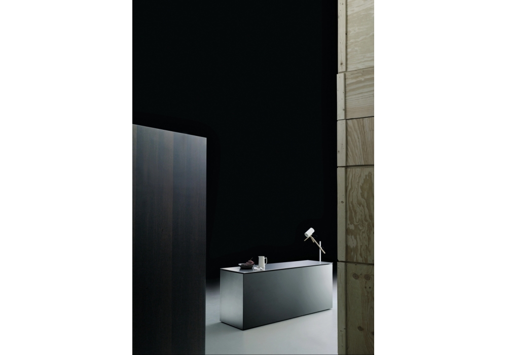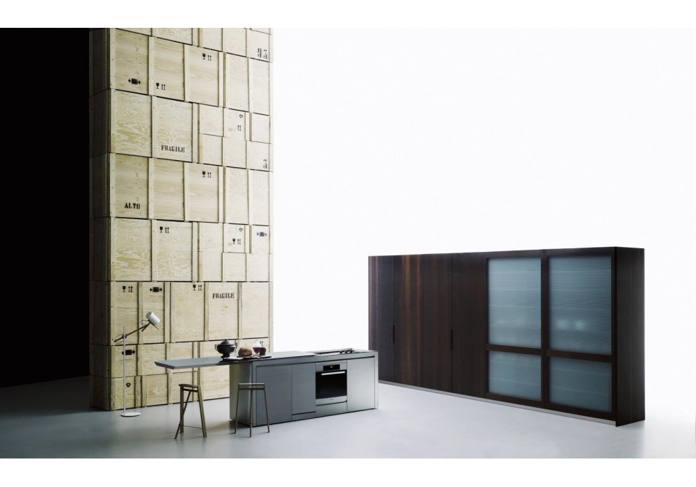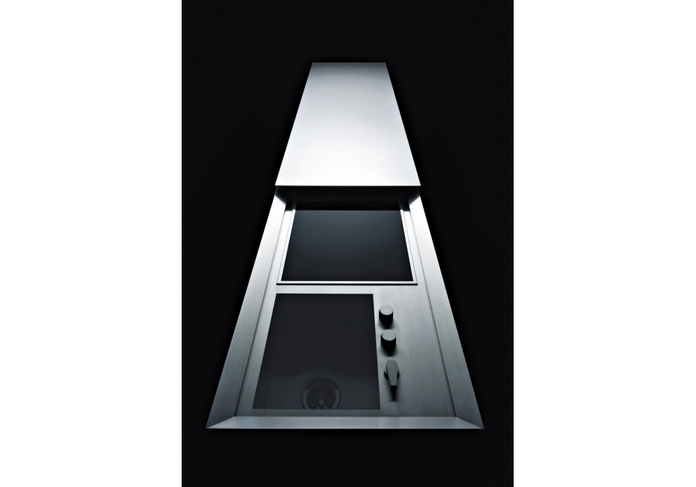 K2, von Norbert Wangen für Boffi entworfen, ist eine Küche mit verschiebbarer Arbeitsplatte, Vierflammkochfeld und Spüle mit individuell gestalteten Armaturen aus massivem Edelstahl. Es ist Teil der "K" -Serie.