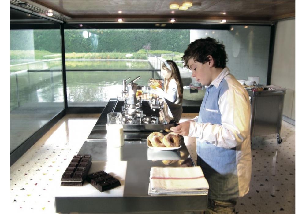 Die Zusammensetzung Küche 130 von Alpes Inox, besteht Kochelement mit seitlichem Spülelement, Backofen und Wagen.