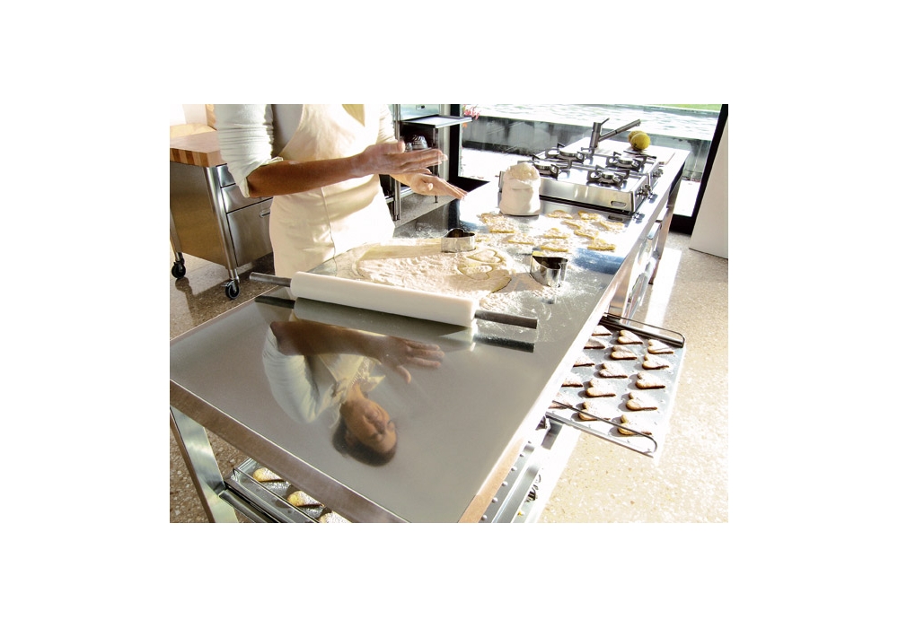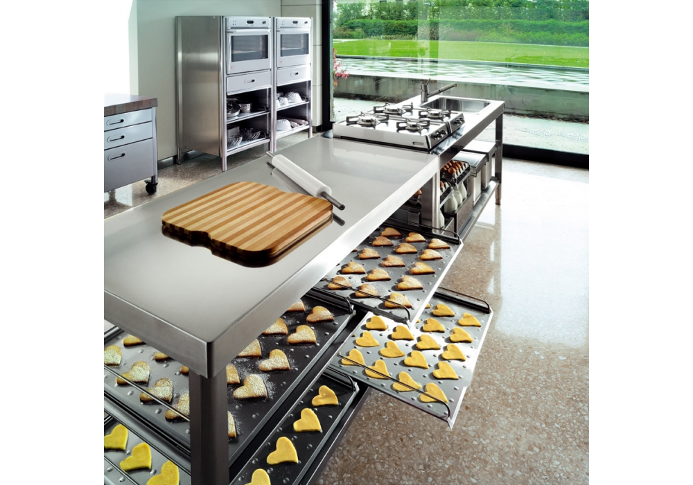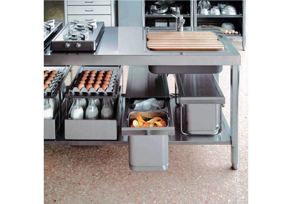Die Küche 160 von Alpes Inox, besteht Küchenelemente zum Spülen, Kochen, Aufbewahren, Kühlschrank, Weinkeller.