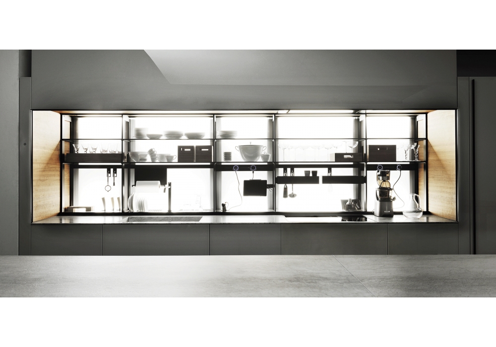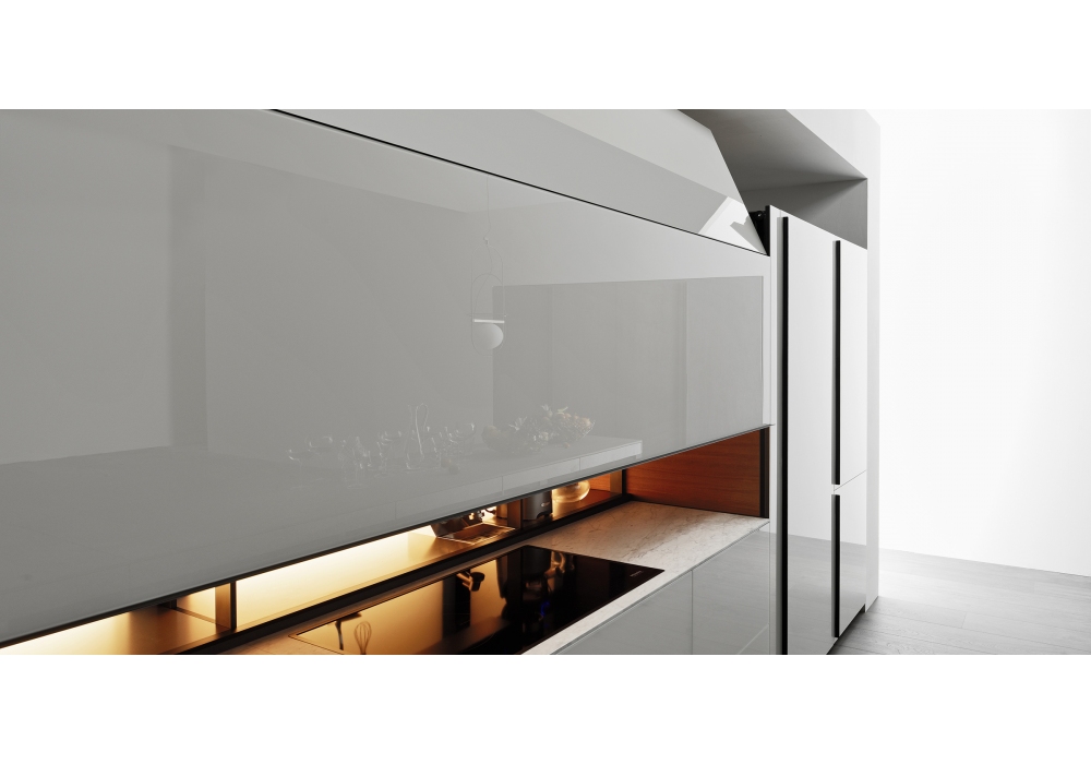 Logica Celata von Gabriele Centazzo für Valcucine entworfen, ist eine Küche, die auf ein facettenreiches Design ausgerichtet ist, auf die Menschen zugeschnitten ist, mit geneigten und mikrogedrehten Kanten gebaut wurde, um den Gebrauch ohne Griffe zu erleichtern und die Praktikabilität und ästhetische Reinheit wiederherzustellen. Die Spitzen können in Glas, Laminat, Stein oder Stahl sein. Türen in Melamin, MDF, Engelshaut oder Glas.