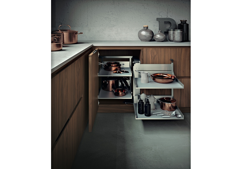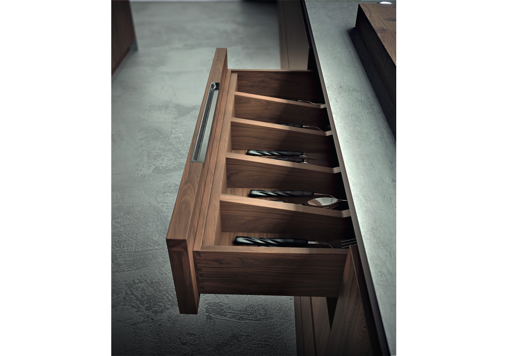 La Cucina von Matteo Thun für Riva 1920 entworfen, ist eine modulare Küche, die aus Teilen aus Massivholz und furniertem Sperrholz besteht und aus verschiedenen Elementen besteht. Küchenunterschränke und Oberschränke, mit geschlossenen Modulen, Kipp- und Flügeltüren. Pantry-Hochschränke mit Flaschenregalen, Kabelfächern für die Stromversorgung von Kleingeräten, Hochschränken mit integrierten Geräten, alle mit Flügeltüren aus furniertem Sperrholz oder Rauchglas erhältlich. Offenes Fach zwischen Säulen, Unterschränken und Hängeschränken, ausgestattet mit Getränkehaltern und Regalen, die es Ihnen ermöglichen, Zubehör und kleine Gegenstände ordentlich zu verstauen.