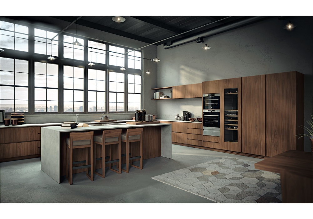La Cucina, von Matteo Thun für Riva 1920 entworfen, ist eine modulare Küche, die aus Teilen aus Massivholz und furniertem Sperrholz besteht und aus verschiedenen Elementen besteht. Küchenunterschränke und Oberschränke, mit geschlossenen Modulen, Kipp- und Flügeltüren. Pantry-Hochschränke mit Flaschenregalen, Kabelfächern für die Stromversorgung von Kleingeräten, Hochschränken mit integrierten Geräten, alle mit Flügeltüren aus furniertem Sperrholz oder Rauchglas erhältlich. Offenes Fach zwischen Säulen, Unterschränken und Hängeschränken, ausgestattet mit Getränkehaltern und Regalen, die es Ihnen ermöglichen, Zubehör und kleine Gegenstände ordentlich zu verstauen. Das Modell wird durch ein Inselmodul mit Koch- und Waschbereich vervollständigt, das mit Türen und Schubladen für jeden Bedarf ausgestattet ist, neben dem Snackelement aus Massivholz mit natürlichen Seiten und einem besonderen Sockel aus Irondust-Eisen, der an ein antikes Rad erinnert.