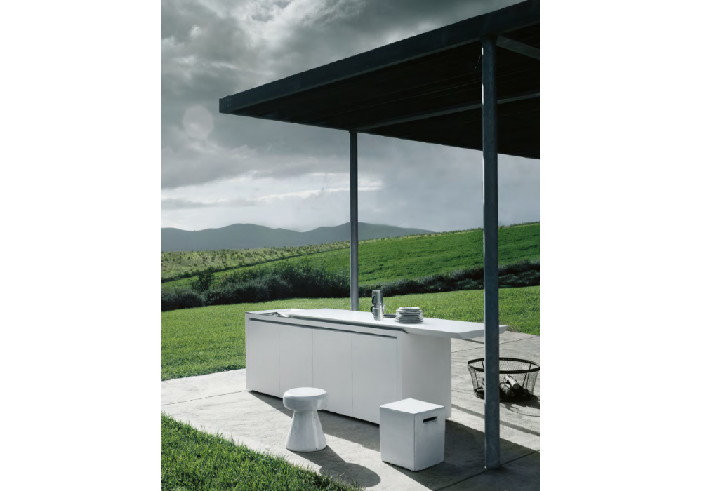 K2 Outdoor, entworfen von Norbert Wangen, ist eine eigenständige Monoblock-Küche, die alle zum Kochen notwendigen Elemente enthält, ein zeitgemäßes und elegantes Möbelstück, das alle Eigenschaften für den Einsatz in offenen Räumen aufweist.