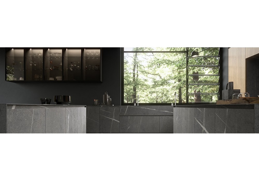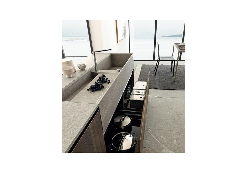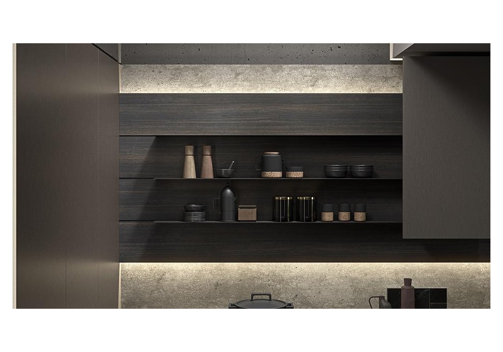 Twenty, entworfen und hergestellt von Modulnova, ist eine Küche, die Volumen und Materialien auf geschickte Weise kombiniert. Die Arbeitsplatte kann aus Eiche in Milltech oder Laminat hergestellt werden; es ist in die Boiserie integriert, mit LED-Beleuchtung. Die dünnen Dicken werden durch Eisenregale verstärkt, die mit Materialien wie Piasentina-Stein kombiniert werden können. Wenden Sie sich an unseren Kundendienst, um Ihren Twenty mit den von Ihnen bevorzugten Funktionen zu erstellen.