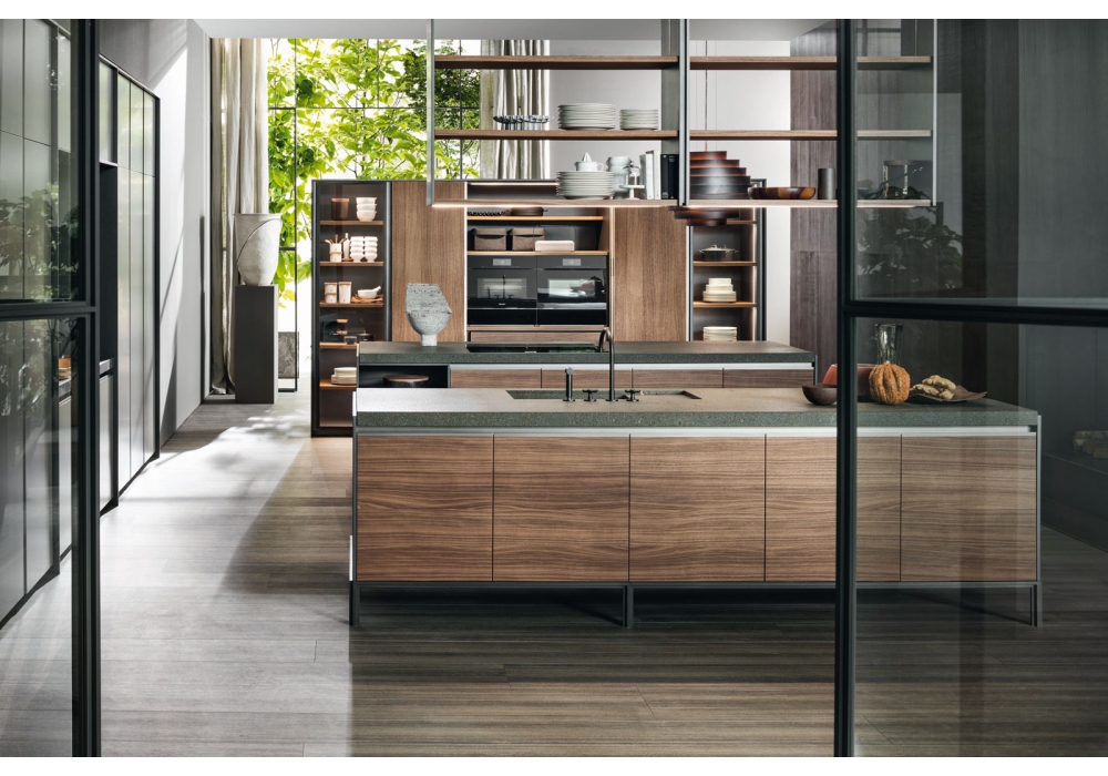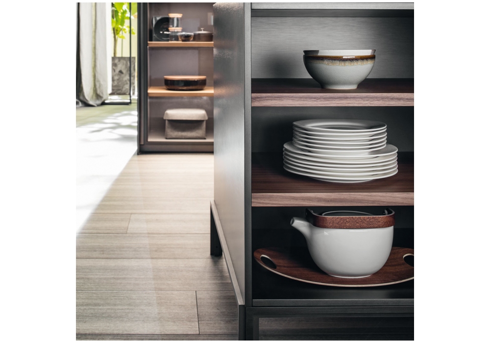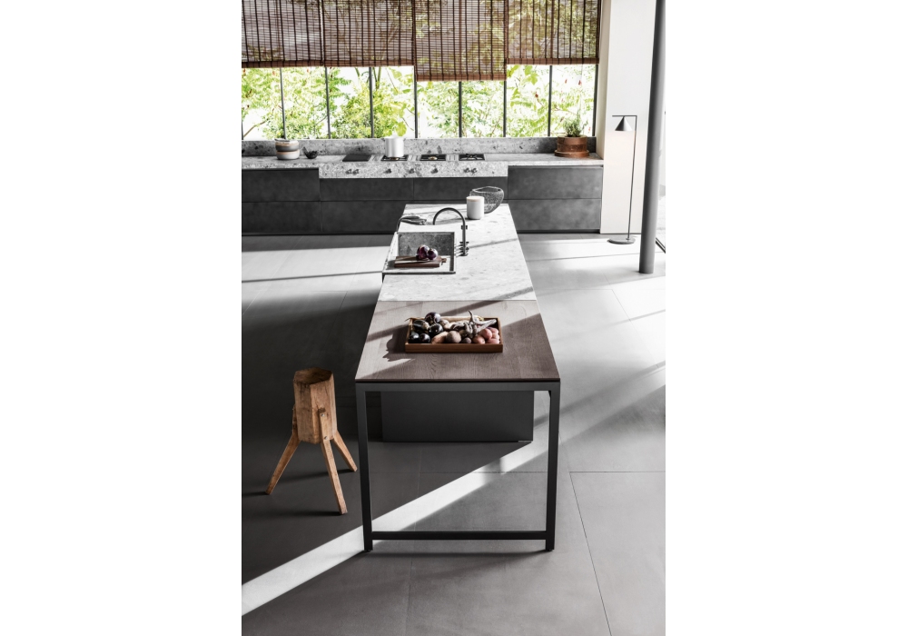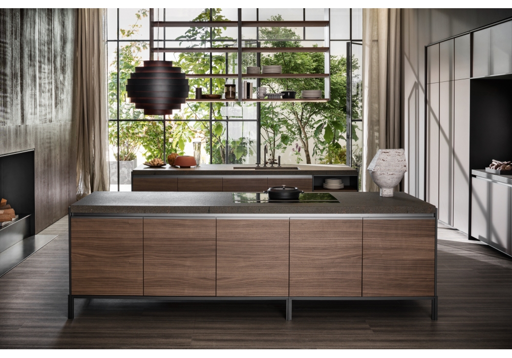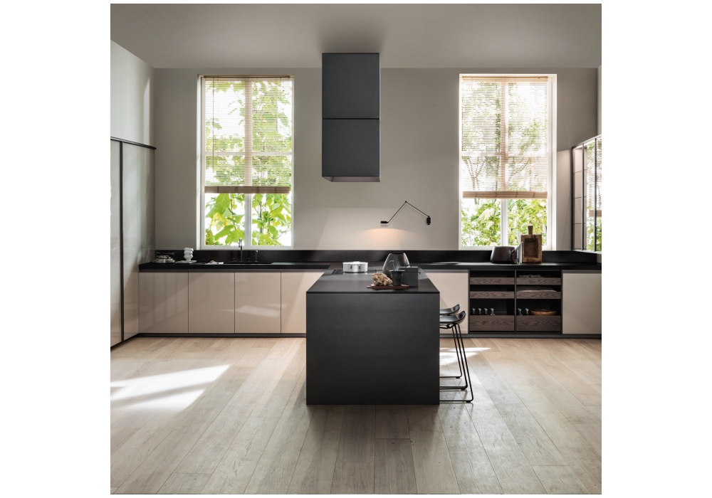 VVD von Vincent Van Duysen für Molteni&C entworfen, ist eine grifflose Küche, die auf dem Kontrast zwischen den dicken Seiten und Enden und den starken Dicken der Arbeitsplatten basiert, die Stein integrieren und die Linearität der Platte unterbrechen. Abgerundet wird das Projekt durch große ausziehbare Tabletts, offene Schubladen und Trolleys, die in die Unterbauten integriert werden können. Die Innovation drückt sich in technologischen Details aus, wie der integrierten LED-Leiste, dem Aluminiumprofil, das den Türgriff dezent gestaltet und seinen Halt verbessert, und dem innovativen Drehscharnier, das eine Öffnung der Türen um 180 ° ermöglicht und den Innenraum besser nutzbar macht. Es erhält ein neues Aussehen dank der hellen Oberschränke aus transparentem Glas mit amortisiertem Mikroscharnier.