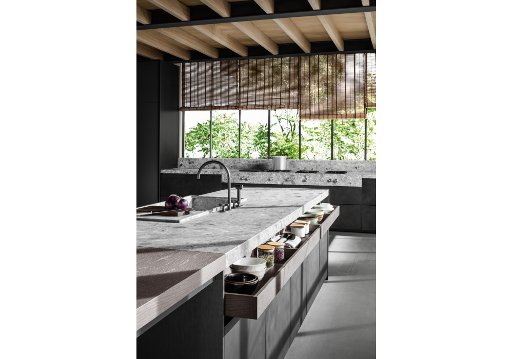 VVD von Vincent Van Duysen für Molteni&C entworfen, ist eine grifflose Küche, die auf dem Kontrast zwischen den dicken Seiten und Enden und den starken Dicken der Arbeitsplatten basiert, die Stein integrieren und die Linearität der Platte unterbrechen. Abgerundet wird das Projekt durch große ausziehbare Tabletts, offene Schubladen und Trolleys, die in die Unterbauten integriert werden können. Die Innovation drückt sich in technologischen Details aus, wie der integrierten LED-Leiste, dem Aluminiumprofil, das den Türgriff dezent gestaltet und seinen Halt verbessert, und dem innovativen Drehscharnier, das eine Öffnung der Türen um 180 ° ermöglicht und den Innenraum besser nutzbar macht.