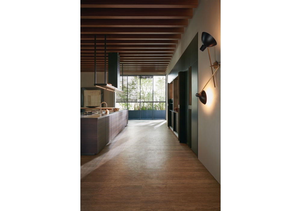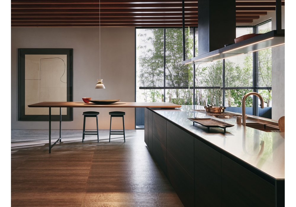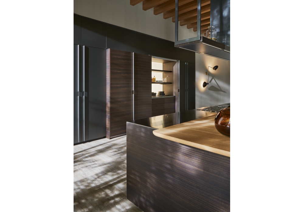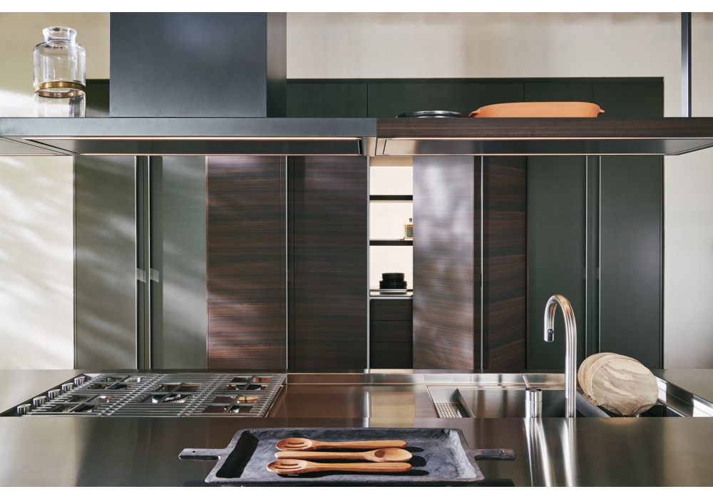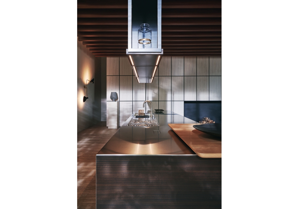 Hi-Line 6 Frame Door von Molteni&C entworfen, ist eine einfache, lineare Küche, die mit der neuen Frame Door verschönert wird. Rahmen aus Titan-Aluminium und Zinn, mit einer Auswahl an feinen Oberflächen für die Fassaden. Der obere Teil der Tür ist so geformt, dass der Griff ergonomisch ist. Die Komposition wird durch das neue Regalsystem mit integrierter VVD-Haube und durch die neue Snackbar Hi-Line6 mit Platte aus massiver heller Eiche und schwarzer Eiche mit abgerundeten Kanten und Profilen auf einer Aluminiumstruktur aus Titan und Zinn vervollständigt. Edle Materialien wie Eukalyptus für die Inselbasis und Stahl für die Platte mit integriertem Spülbecken und Kochfeld.