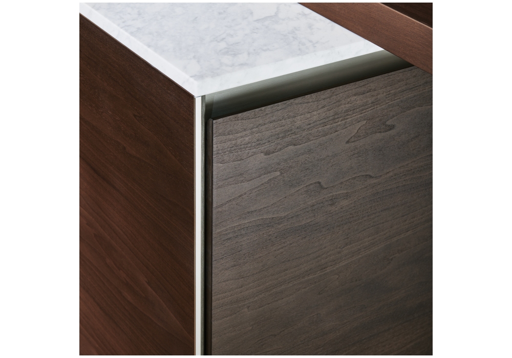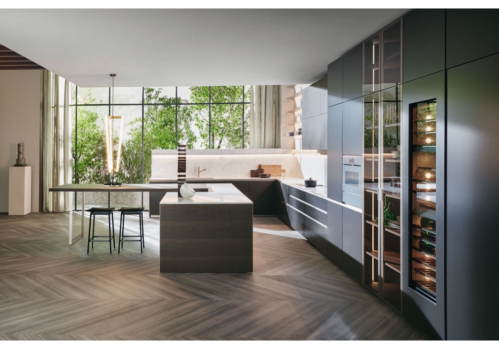 Prime von Molteni&C entworfen ist eine Küche, die sich durch eine Öffnung mit Nut auszeichnet.Es ist in zahlreichen Kompositionsvarianten für die anspruchsvollsten ästhetischen Anforderungen verfügbar. Die Schlucht zieht sich ohne Unterbrechung durch die Küche und endet auf der Hüfte. Die Tür von Prime ist oben bei 45° geformt, um das Öffnen einfacher und ergonomischer zu machen. Das Projekt umfasst auch die neue Glastür in den Oberflächen Bronze und Smoked für Flair Hängeschränke und Hochschränke, beleuchtet mit LED-Profilen, die in den Seiten der Module verborgen sind, und das neue Wing-System mit Regalen aus Aluminium. Der Snack Prime vervollständigt die Komposition mit einer Struktur aus Titanaluminium und Zinn und einer Platte aus der neuen Essenz dunkler Walnuss.