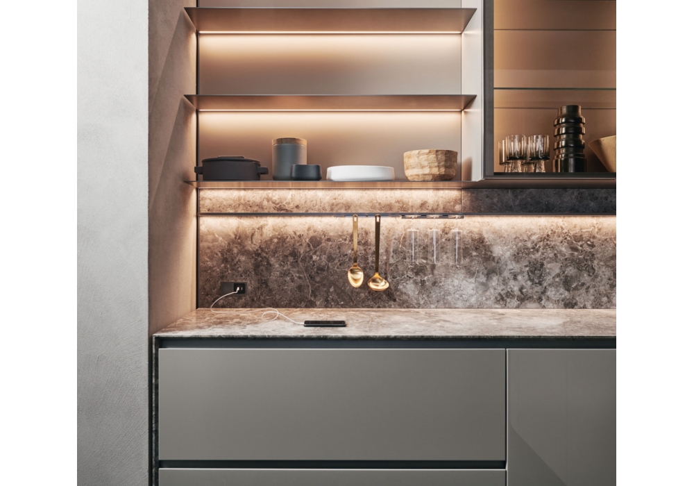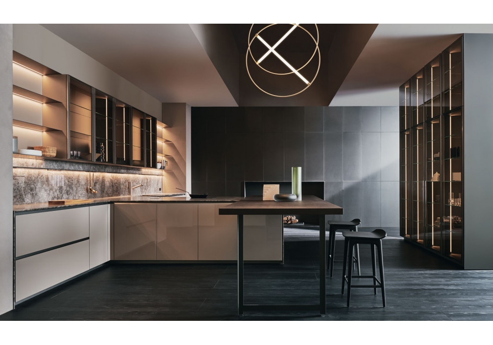 Prime von Molteni&C entworfen ist eine Küche, die sich durch eine Öffnung mit Nut auszeichnet.Es ist in zahlreichen Kompositionsvarianten für die anspruchsvollsten ästhetischen Anforderungen verfügbar. Die Schlucht zieht sich ohne Unterbrechung durch die Küche und endet auf der Hüfte. Die Tür von Prime ist oben bei 45° geformt, um das Öffnen einfacher und ergonomischer zu machen. Das Projekt umfasst auch die neue Glastür in den Oberflächen Bronze und Smoked für Flair Hängeschränke und Hochschränke, beleuchtet mit LED-Profilen, die in den Seiten der Module verborgen sind, und das neue Wing-System mit Regalen aus Aluminium.