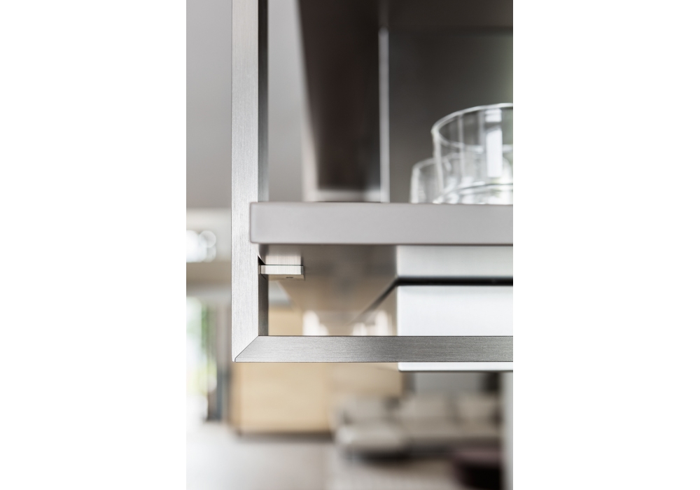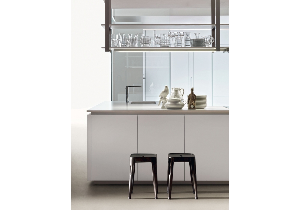 Hi-Line 6 von Ferruccio Laviani für Molteni&C entworfen, ist eine einfache und geradlinige Küche. Ein Raum, der mit Esprit de Géométrie organisiert ist, kombiniert mit strengen Formen, Detailreichtum und Aufmerksamkeit für die Bauqualität. Die Basen sind höher, um alles aufzunehmen und besser. Weit entfernt vom klassischen Küchenkonzept lässt Hi-Line 6 zahlreiche Gestaltungsmöglichkeiten zu. Kein Griff, sondern eine Nut zum Öffnen und Schließen der Türen.