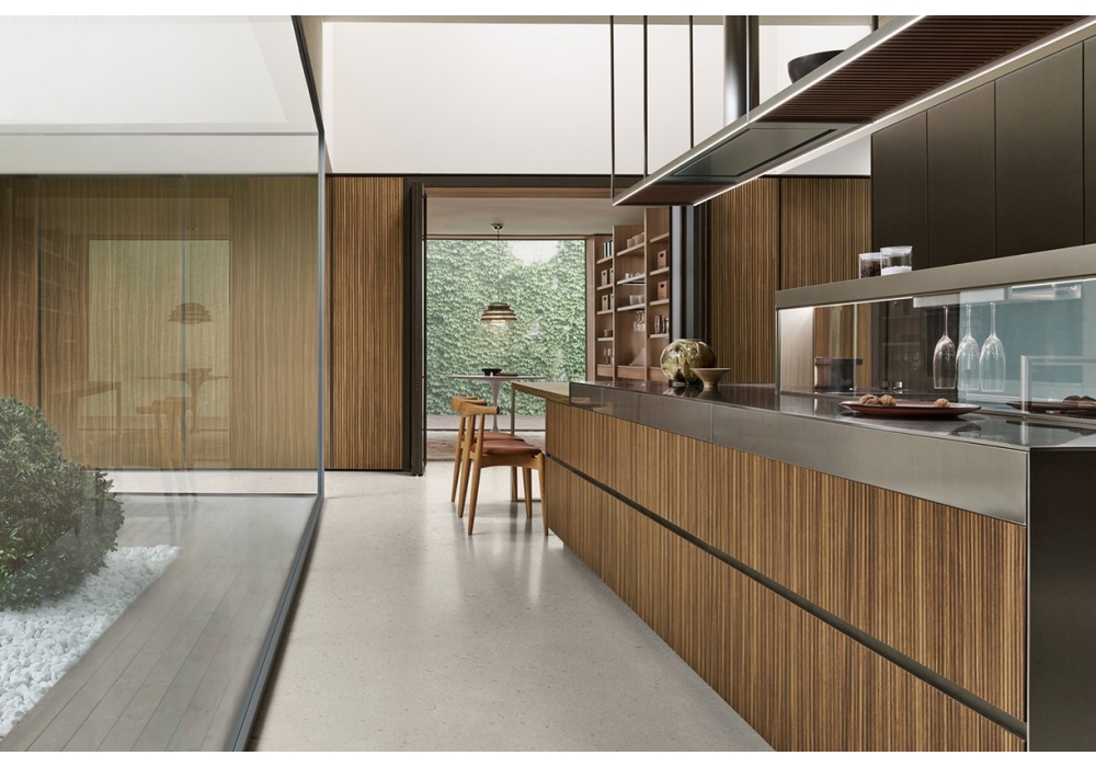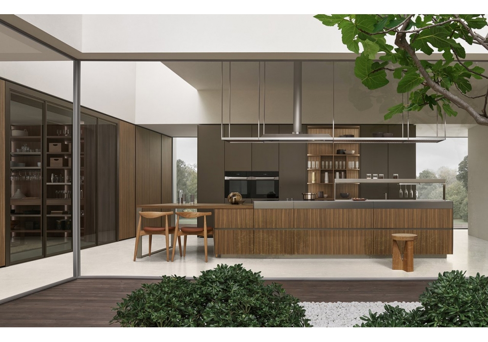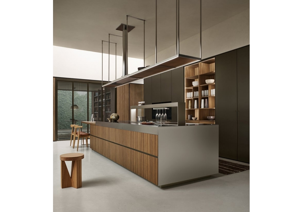 Sign 01 von Ernestomeda entworfen, ist eine Küche, die aus einer Arbeitsinsel mit integriertem Tisch, einer Arbeitsplatte aus gebürstetem Stahl, einem Bridge-System mit allen wesentlichen Zubehörteilen und offenen Hochschränken von Daylight besteht. Das Ergebnis ist eine informelle Küche, die sich durch große Aufmerksamkeit für Materialien auszeichnet, in einem Mix aus Farben, die elegante Umgebungen mit starker emotionaler Wirkung schaffen.