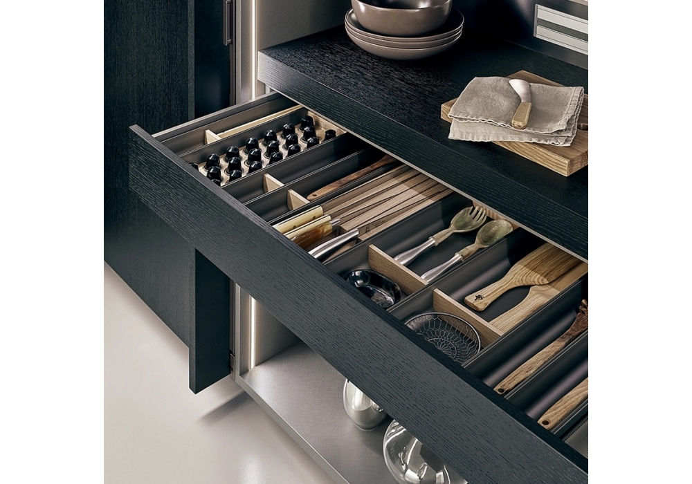 K-lab 02 von Ernestomeda entworfen, ist eine Küche, die sich durch ein System offener Elemente mit Metallstruktur auszeichnet, inspiriert von den großen Werkbänken industrieller Umgebungen. Ein gastronomisches Labor, die Idee des Kochens als Werkstatt. Eleganz und Qualität der Materialien für eine Küche zum Genießen, offen zum Wohnzimmer, gekennzeichnet durch modulare und anpassbare Elemente. Wie die Indoor-Kleiderschränke in offenporiger schwarzer Eiche mit eingelassenen Türen, die mit mehreren Innenausstattungen ausgestattet sind.