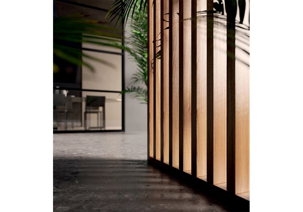 One 03 von Ernestomeda entworfen, ist eine Küche, die aus Oberschränken, Regalen und einer Halbinsel besteht, die den Raum erweitert und Küche und Wohnbereich miteinander verbindet: Jedes Einrichtungsdetail dieser Küche hebt die Materialität der Oberflächen hervor und bietet gleichzeitig maximale Funktionalität.