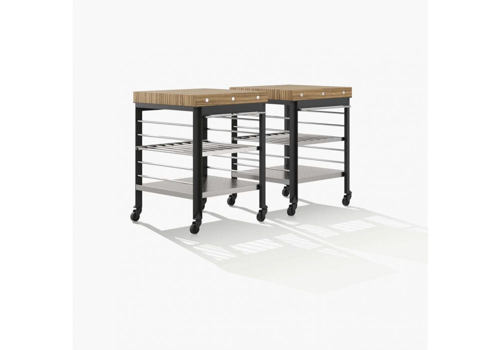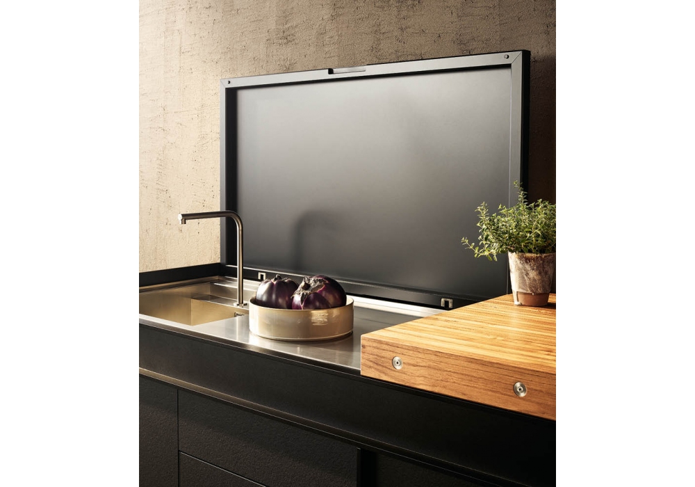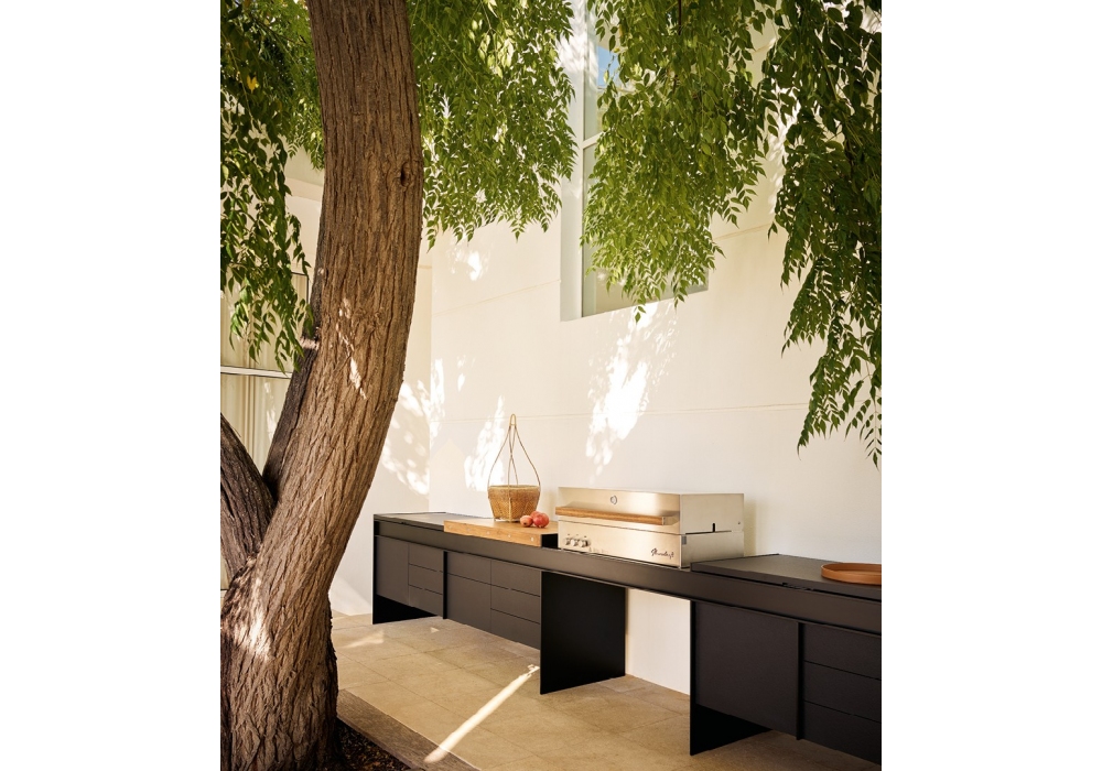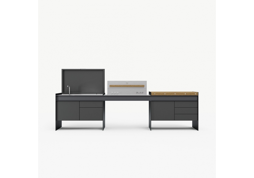 Land von R&D Poliform und Cap entworfen, ist eine Outdoor-Küche, die aus einer Reihe von Modulen besteht, die an Längsträgern befestigt sind, die sie schwebend erscheinen lassen. Erhältlich in zwei wandmontierten oder freistehenden Versionen und aus Aluminium, Inalco MDi® und Stahl, Materialien, die für den Außenbereich geeignet sind. Es benötigt keinen Stromanschluss, da alle Funktionen gas- oder batteriebetrieben sind, und es ist mit Spüle, Schneidebrett und Grill ausgestattet.