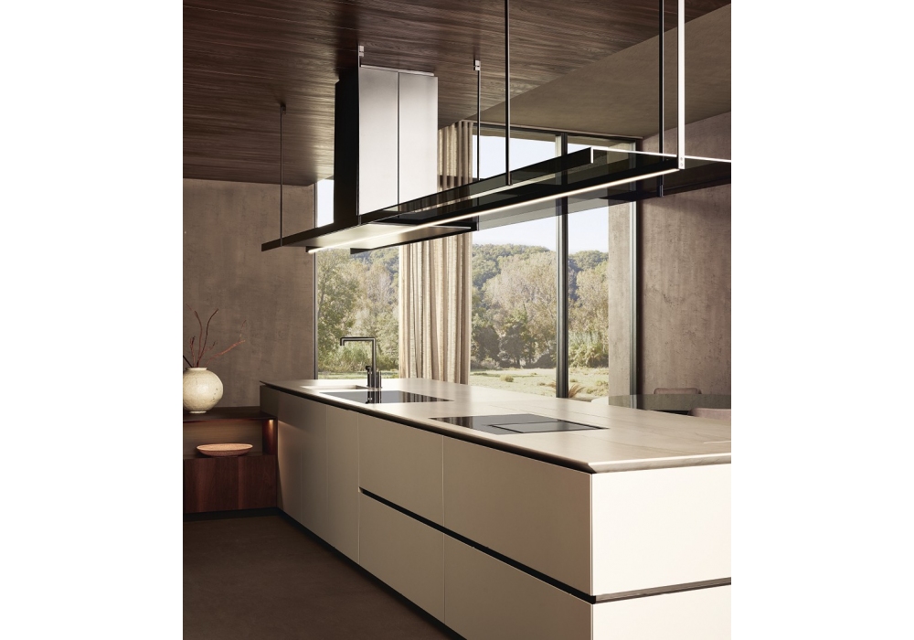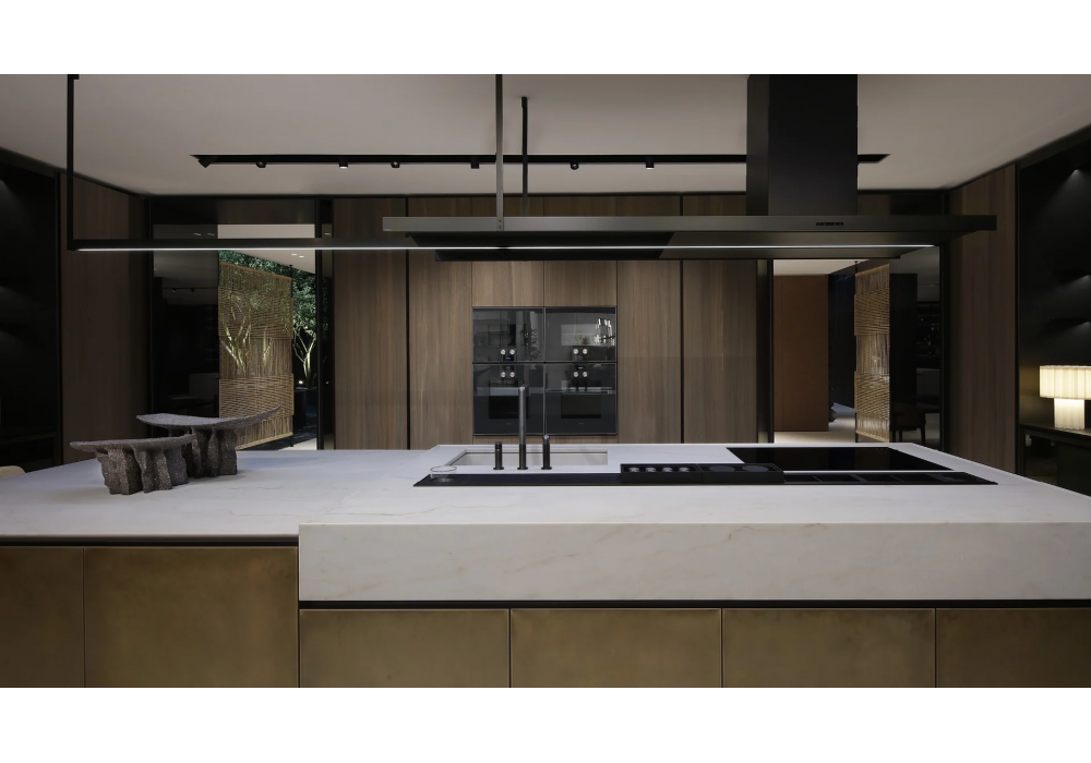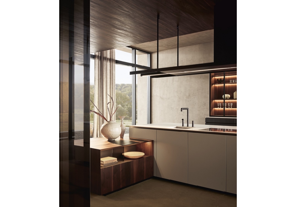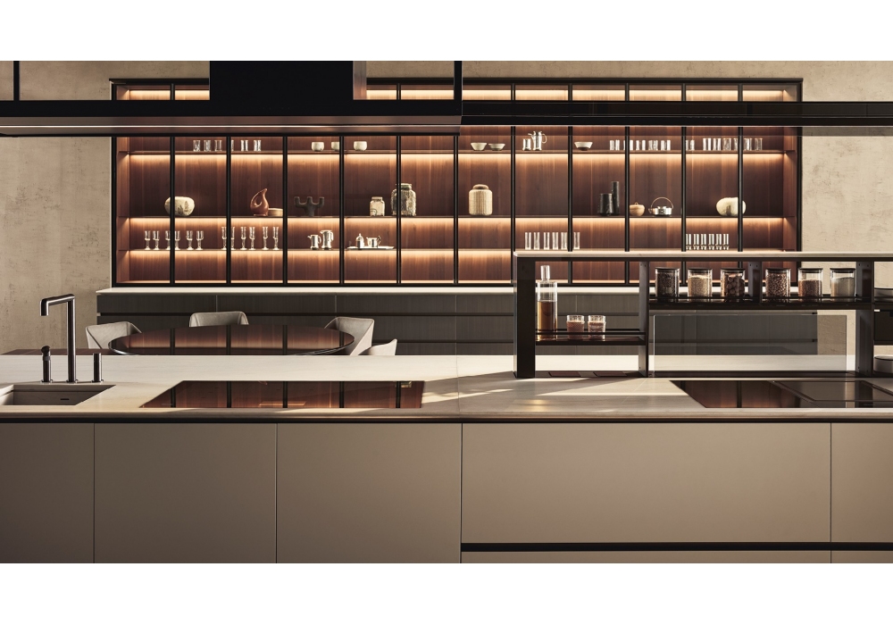 Artex Pro von R&D Poliform entworfen, ist ein Küchensystem mit einer modernen und ansprechenden Ästhetik. Zu den neuen Merkmalen gehören die sich verjüngende Platte, die zu einem Snacktisch für schnelle Mahlzeiten wird, und die Einführung von massiver fossiler Ulme, einem kostbaren antiken Holz, das Artex Pro zur Küche für die exklusivsten Umgebungen macht. Durch seine umhüllende und funktionale U-Form und die nahtlose Integration in das Architectural-System, insbesondere in die Pivot-Türen, beweist Artex Pro auch seine Fähigkeit, die anspruchsvollsten Designanforderungen zu erfüllen.