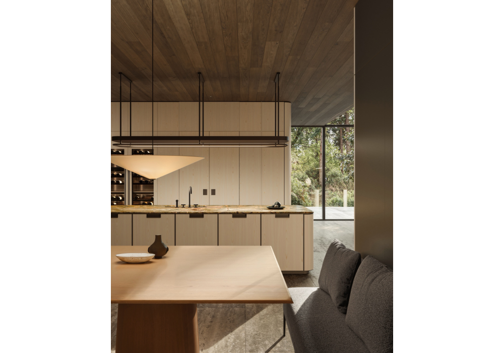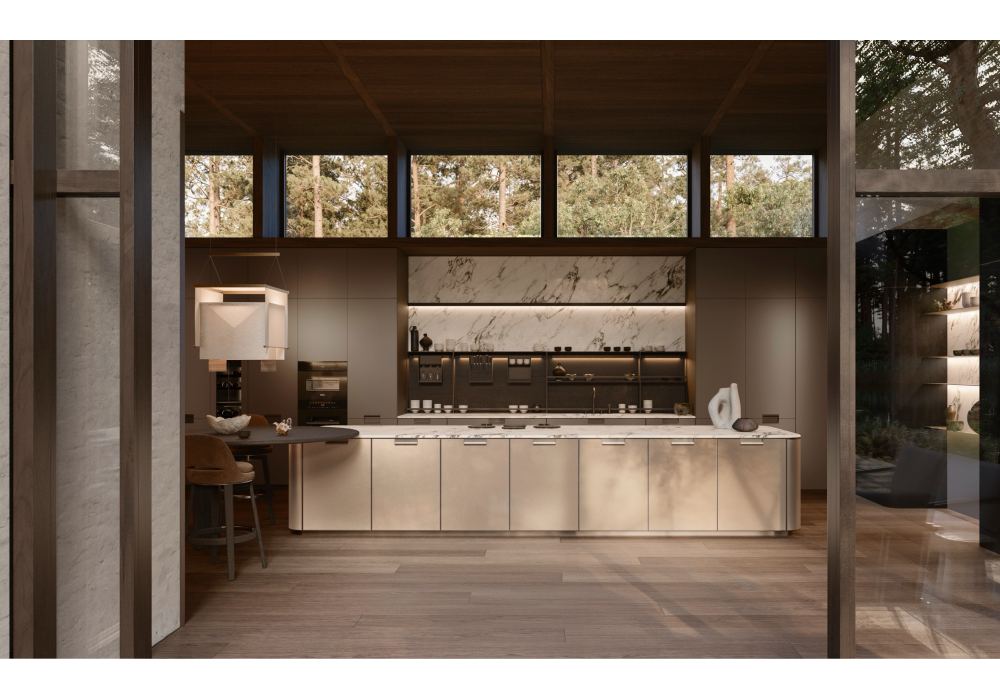 Physis von Vincent Van Duysen für Molteni&C entworfen, ist eine Küche mit zeitgenössischem, organischem Design. Sanfte Linien und abgerundete Ecken schaffen eine einladende, fließende Ästhetik. Die geschwungene Arbeitsplatte mit Metalldetails unterstreicht die Materialkontinuität, während integrierte Griffe und harmonische Formen für eine klare, elegante Optik sorgen. Glaselemente und offene Fächer verleihen Leichtigkeit, die durch die integrierte LED-Beleuchtung ergänzt wird. Ein modulares und vielseitiges System, das sich mit seinem raffinierten, zeitlosen Stil an unterschiedliche Räume anpasst.