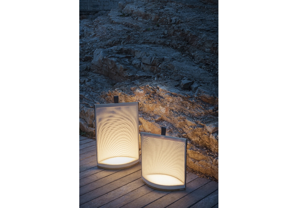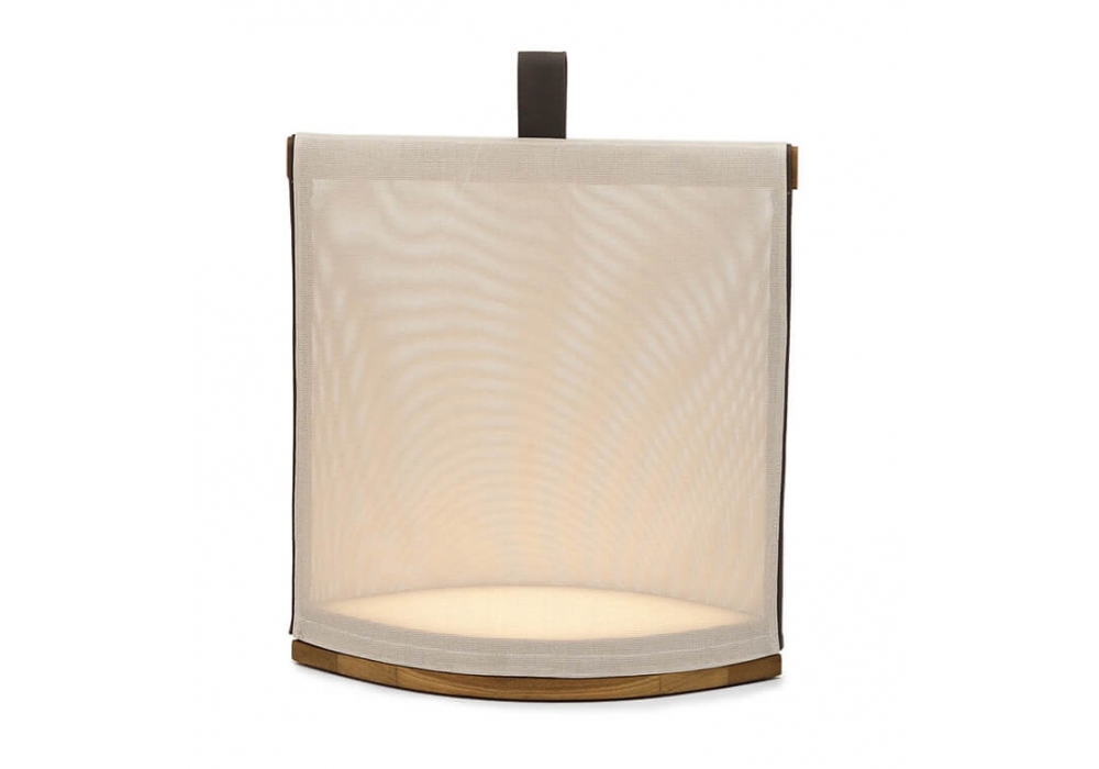 Pillow von Gordon Guillaumier für Roda entworfen, ist eine Laterne aus einem Gestell aus Teakholz und einem Lampenschirm in Canatex. Die LED-Lichtquelle wird von einer Batterie mit 6/8 Stunden Autonomie betrieben.