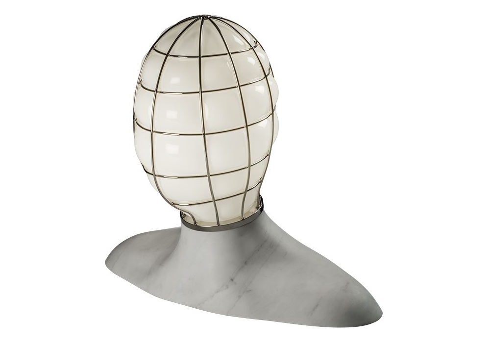 Muse, von Fabio Novembre für Venini entworfen, ist eine lichtskulptur mit menschlichen Zügen, mit Diffusor aus mundgeblasenem Opalglas, verfügbar in 2 Farben. Die Basis ist aus Marmor und der Diffusor ist in einem verchromten Metallgitter eingeschlossen.