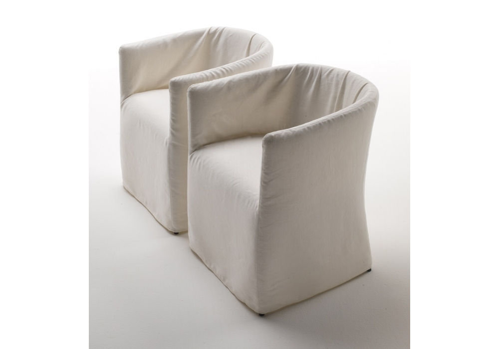 Maja D designed by Piero Lissoni per Living Divani is a small armchair with tubular steel frame, black epoxy powder coating. Seat chassis in poplar plywood with cross-woven coated rubber elastic straps. Seat and backrest padded with insert in polyurethane foam. Covering in 100% polyether thermally bonded onto a polyamide velveteen backing, fixed through Velcro fastenings to the seat chassis in the version with housse.