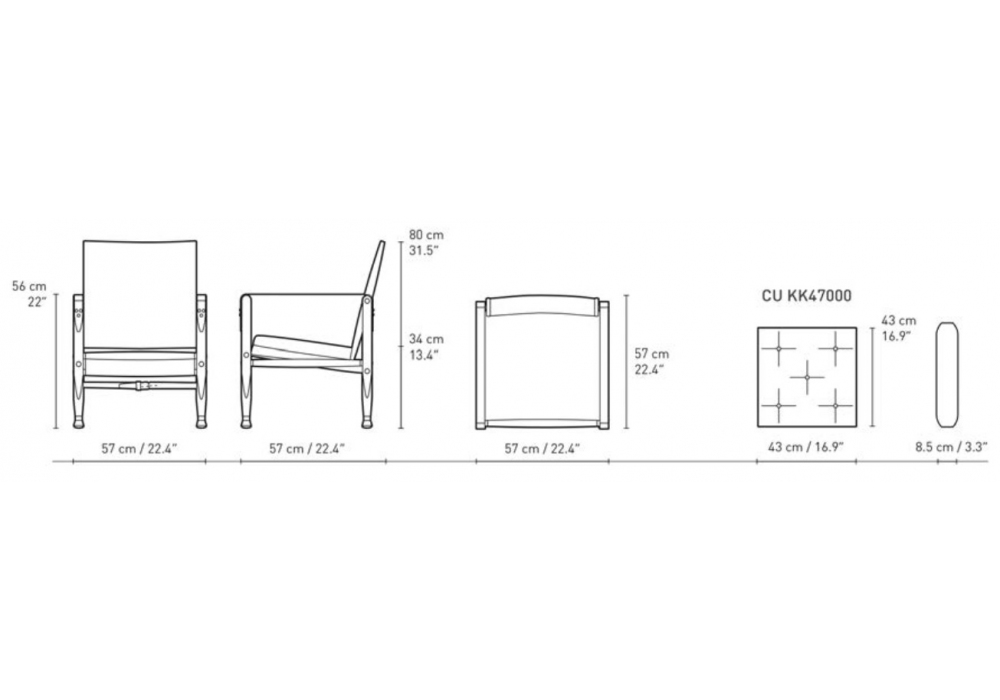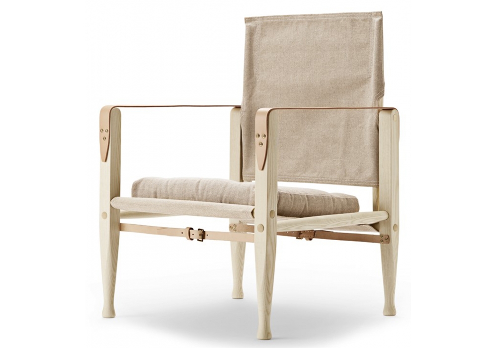 KK47000 Safari von Kaare Klint für Carl Hansen & Søn entworfen, ist ein Sessel mit Struktur aus massivem Eschenholz. Sitz, Rücken und Kissen aus natürlichem Canvas (100% Leinen) oder aus Leder, Armlehnen aus Leder.