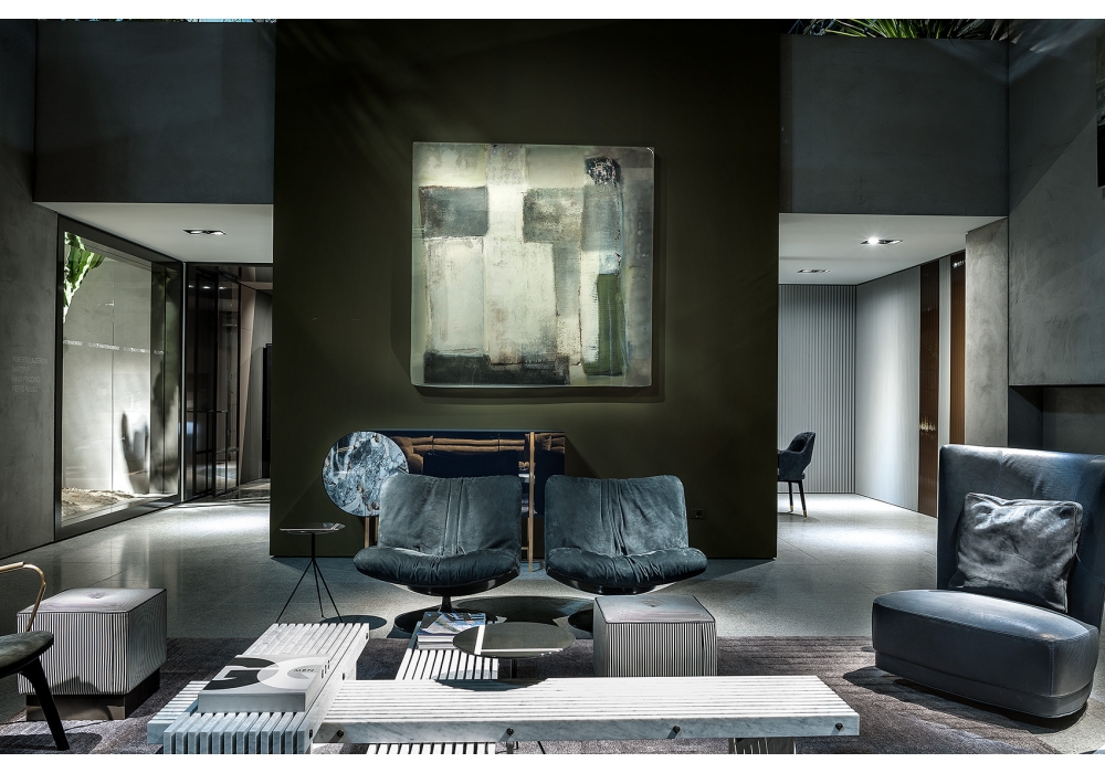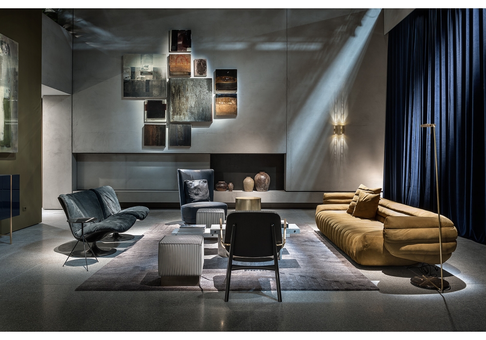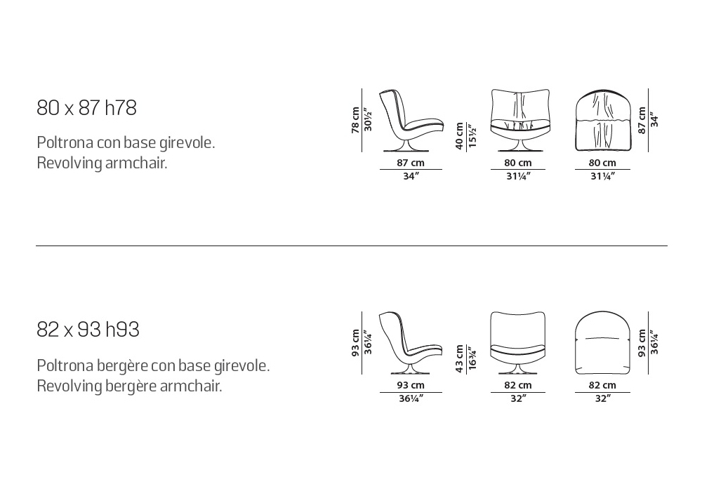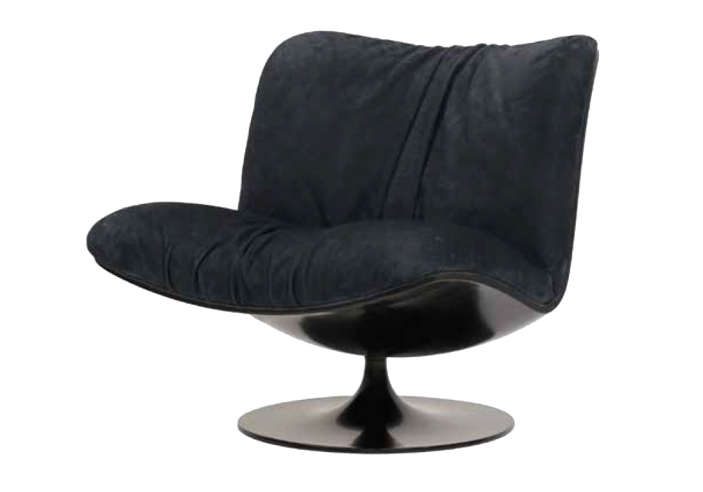 Marilyn von Draga & Aurel für Baxter entworfen, ist ein drehbarer Sessel mit einem mattschwarz lackierten, starren Gestell. Matte schwarz lackierte drehbare Metallbasis. Sitz und Rückenlehne aus Polyurethanschaum mit differenzierter Dichte und Acrylfaserabdeckung, bedeckt mit gewaschener und sterilisierter Gänsedaunen. Dekorative Paspelierung im gleichen Lederton von Innenlehne und Sitz.