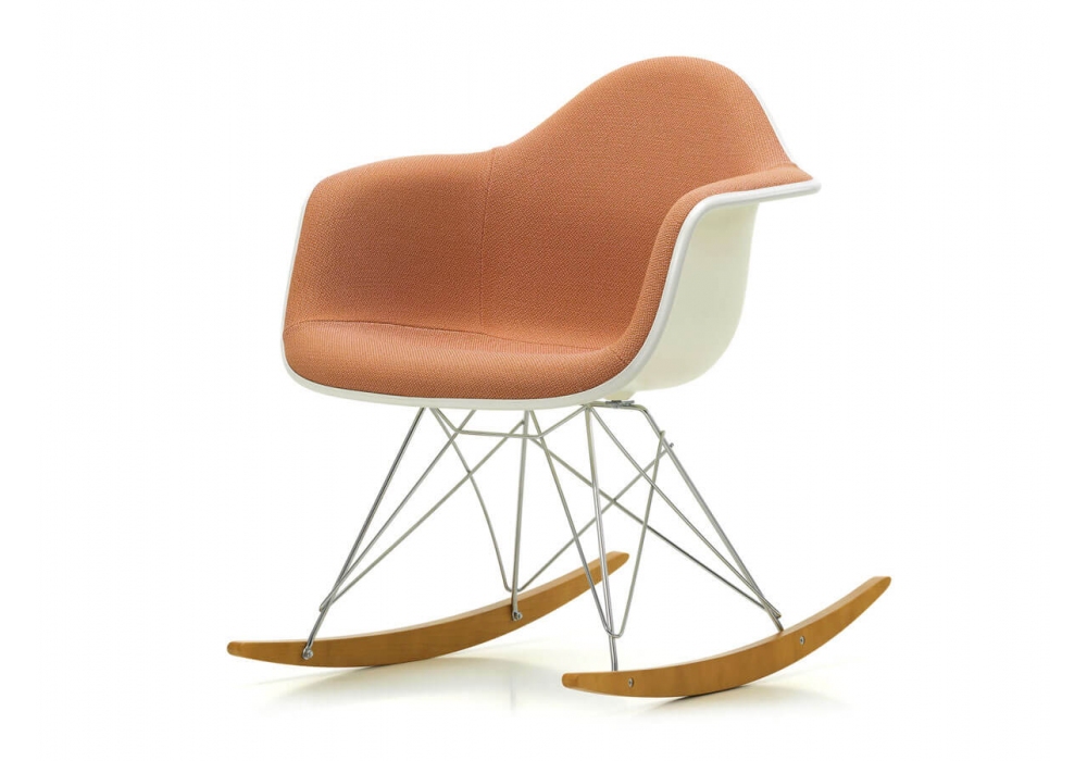Eames Plastic Sessel RAR von Charles und Ray Eames für Vitra ist ein Schaukelstuhl aus der RAR-Kollektion, Polypropylenschale in verschiedenen Ausführungen gefärbt, Sockel mit Stahldrähten mit gekreuzten Ständern in verschiedenen Ausführungen und massive Ahorn Schuhe in zwei Ausführungen. Der gepolsterte Sitz aus Stoff in den verschiedenen Farben der Kategorie F60 Hopsak.