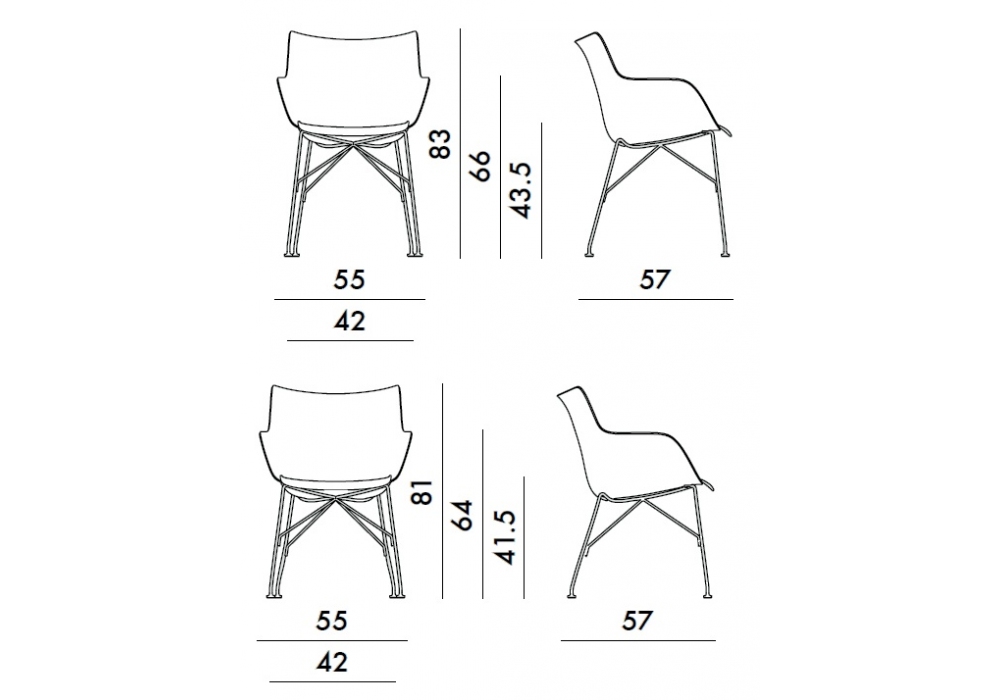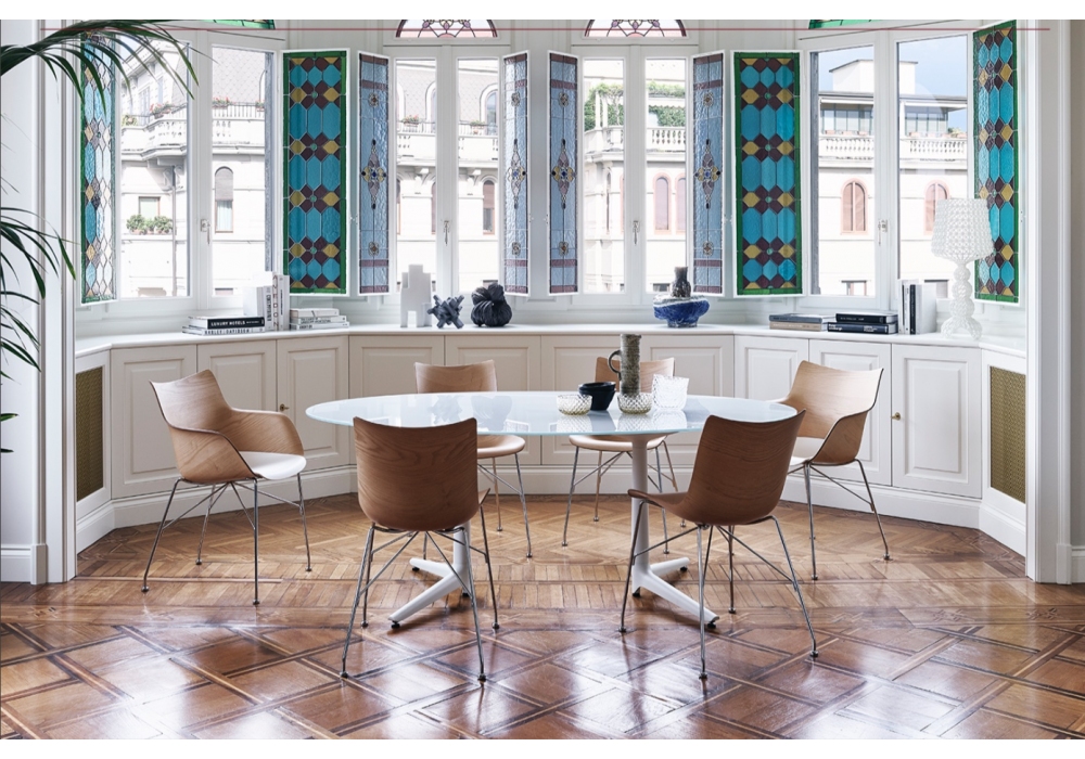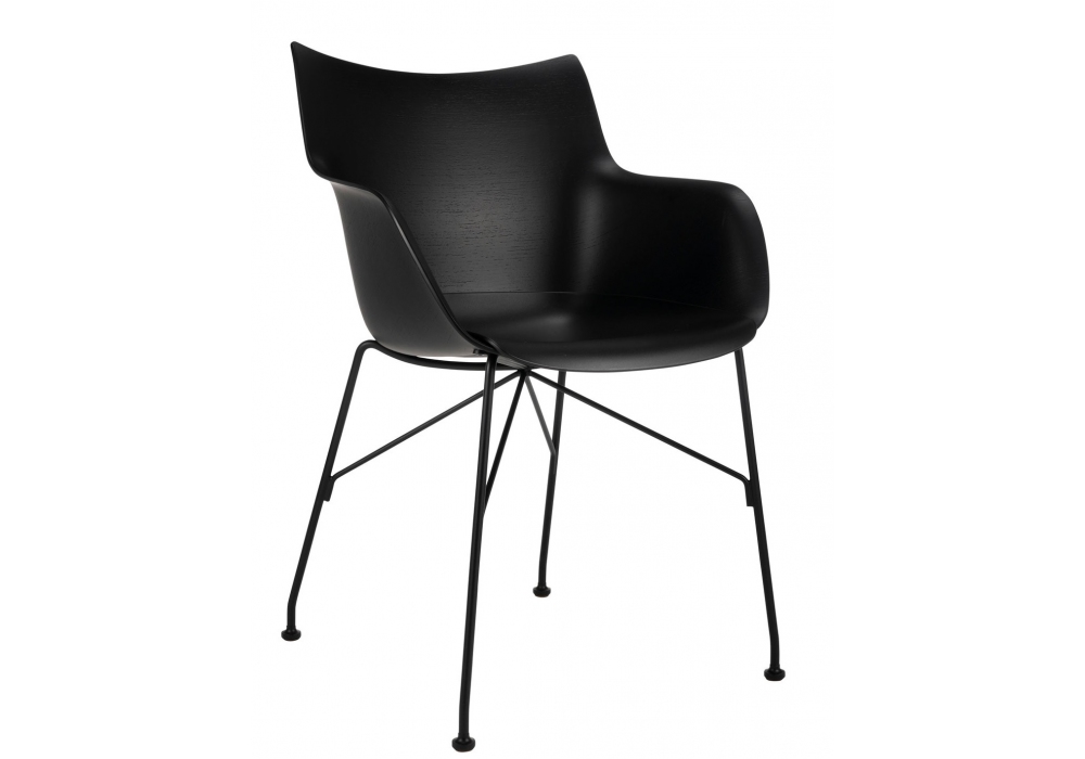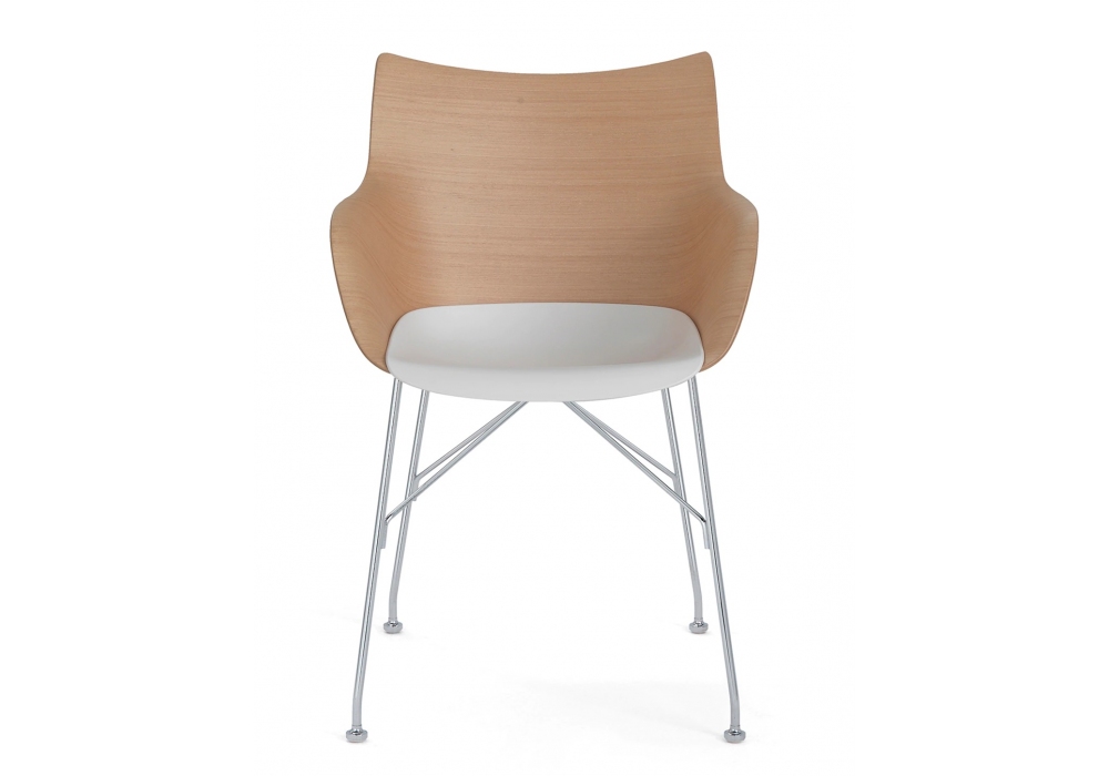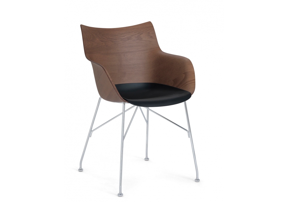 Q / Wood, entworfen von Philippe Starck für Kartell, ist ein Sessel mit Beinen aus verchromtem oder schwarz lackiertem Stahl, Sitz aus thermoplastischem Technopolymer und Schale aus Holz oder Furnier in hellem oder dunklem Finish.