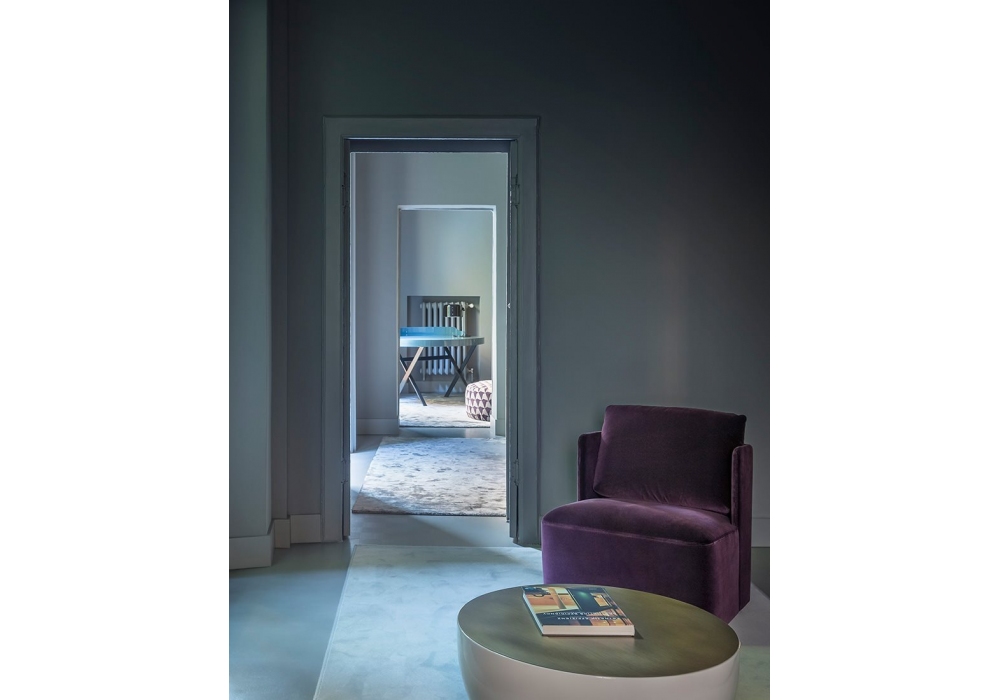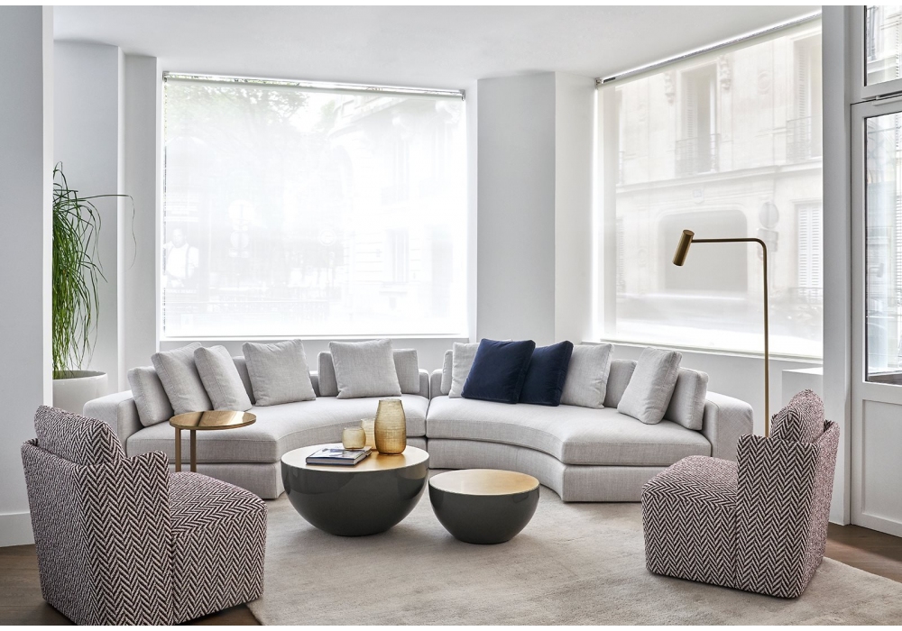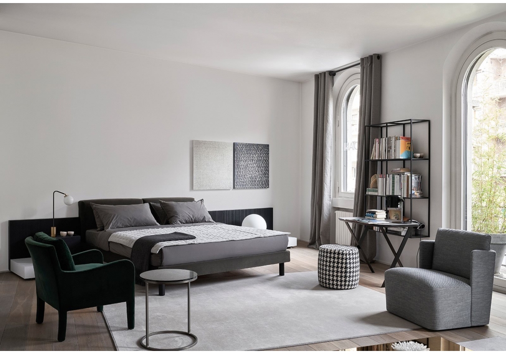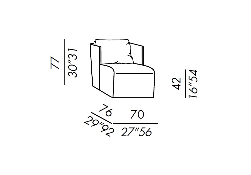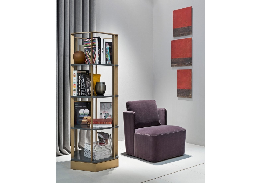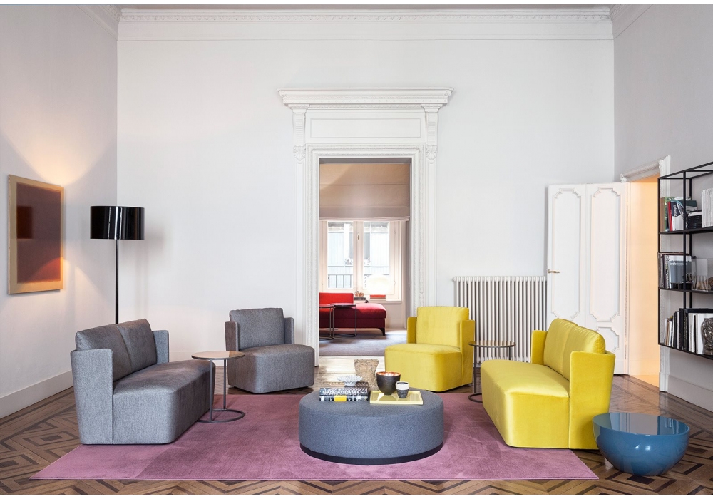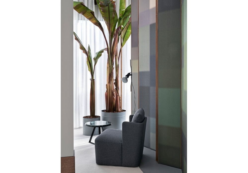 Keeton Fit, von Andrea Parisio für Meridiani entworfen, ist ein kleiner Sessel mit Rückenlehne, Sitz und Rückenkissen bezogen mitStoff oder Leder. Füße ABS Schwarz.