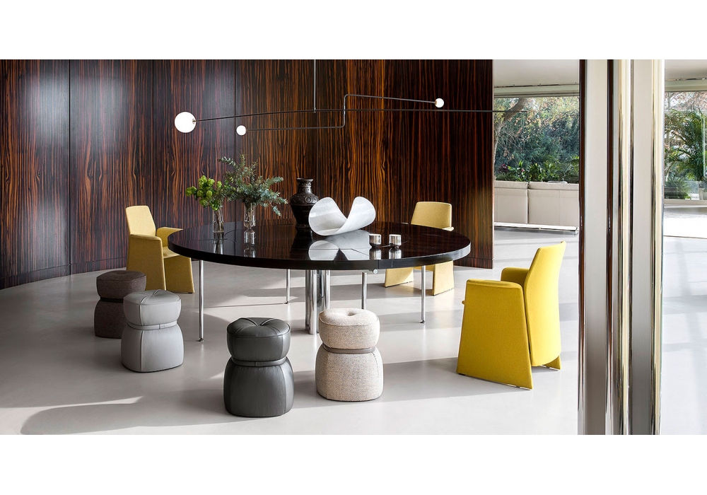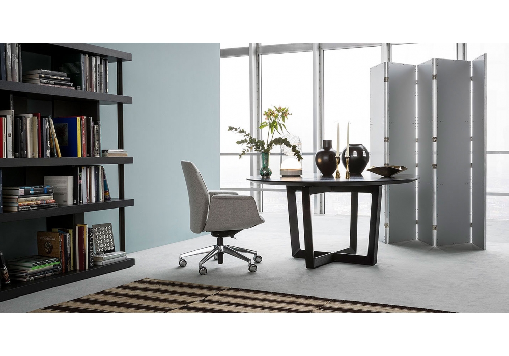 Downtown Conference von Jean-Marie Massaud für Poltrona Frau entworfen, ist ein Sessel, der in drei Versionen erhältlich ist: Drehsessel mit 4 Speichen; Sessel mit Schlittenbasis; Brückensessel. Die Brückenversion besteht aus einer Struktur aus geformtem Polyurethanschaum, einer Einweg-Rollenstütze und sichtbaren Metallplatten, die die Seiten mit der Rückenlehne verbinden. Die anderen Versionen bestehen aus einer Struktur aus geformtem Polyurethanschaum mit einem Metalleinsatz und einer Stahlbasis. Alle Versionen sind mit Leder oder Stoff von Pelle Frau bezogen.